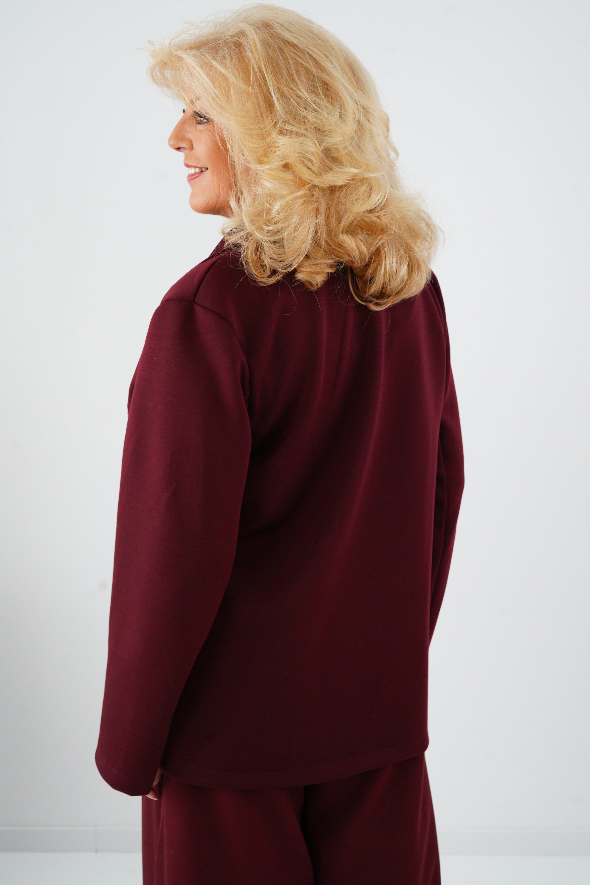 Dieser bordeauxfarbene Blazer bringt Eleganz in deinen Alltag. Ob zum Kleid, zur Hose oder lässig mit Jeans kombiniert – durch die figurschmeichelnde Form und das angenehme Material ist er ein vielseitiger Begleiter für Job und Freizeit.