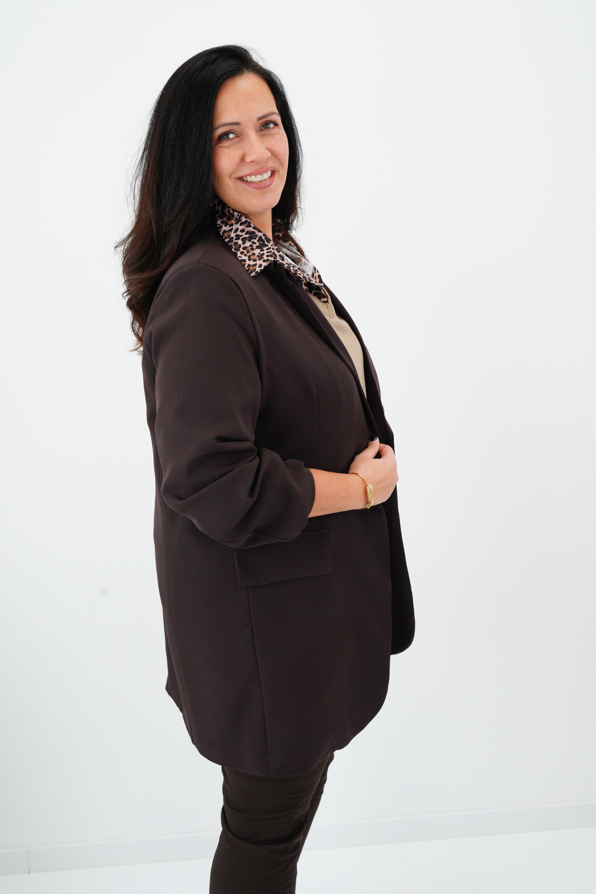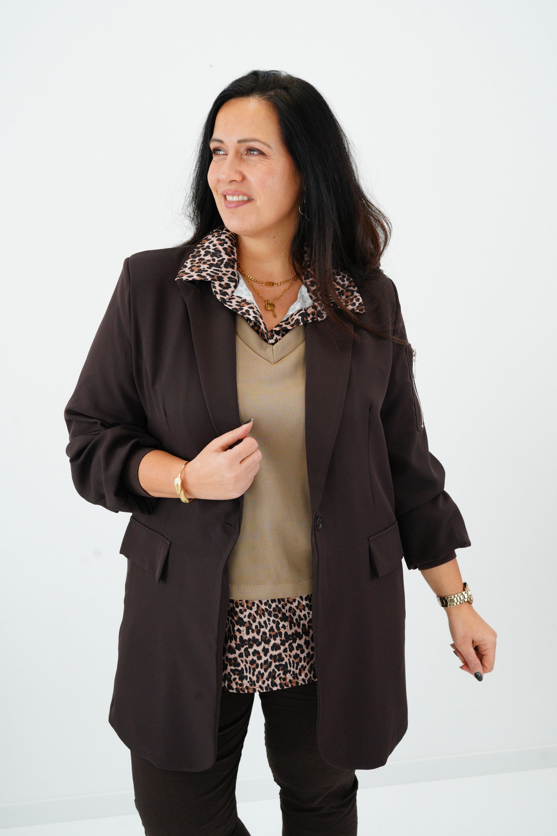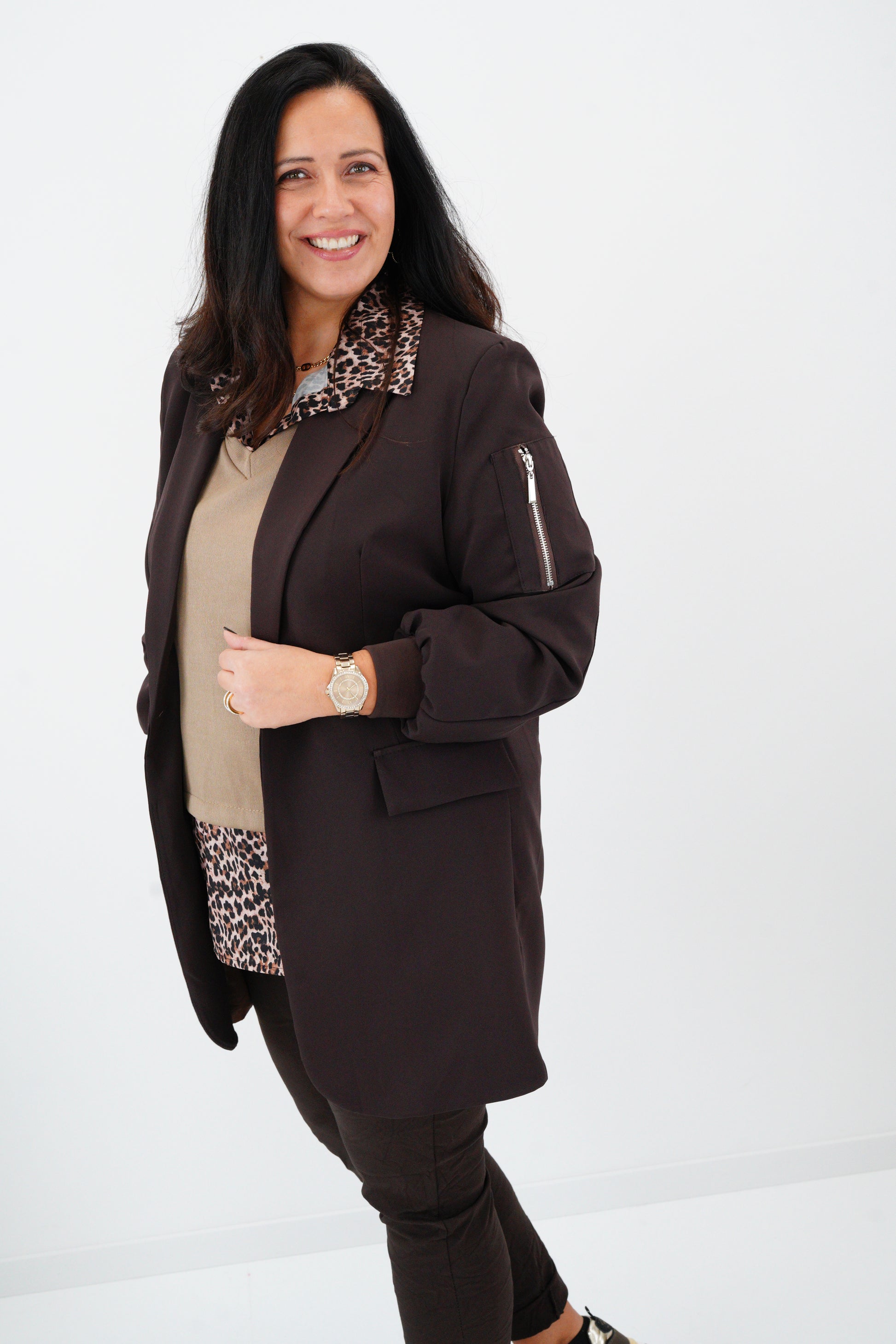 Ein moderner Blazer mit sportivem Touch: Der schokobraune Ton kombiniert sich mit coolen Details wie der Zipper-Tasche am Ärmel und den Bündchen – ideal für lässige Business-Looks oder stilvolle Everyday-Outfits.