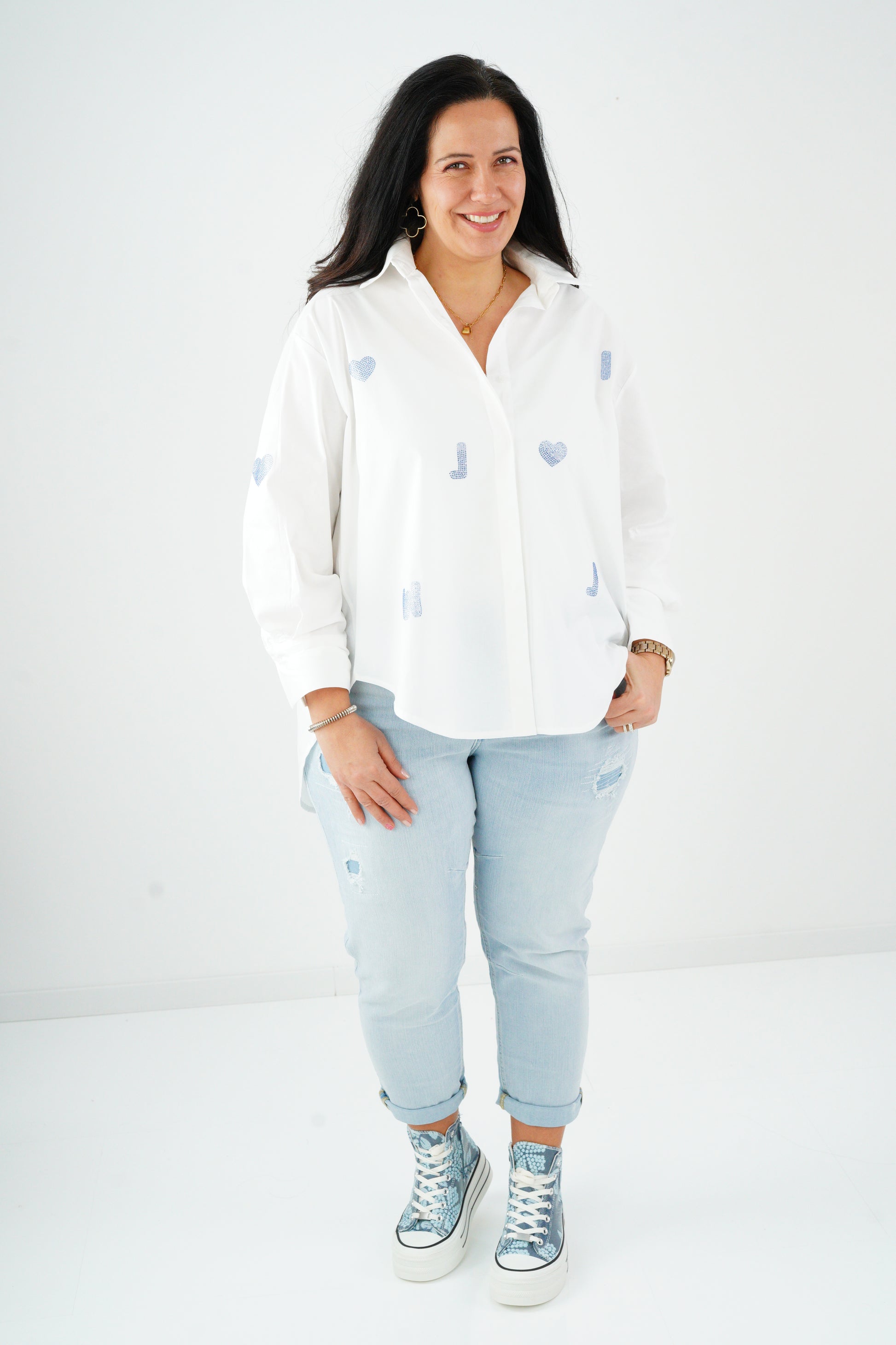 Diese Baumwollbluse kombiniert zeitlose Klassik mit einem Hauch Glamour. Die feinen Strasselemente setzen dezente Highlights und machen die Bluse zum vielseitigen Stylingpartner – ob zur Jeans, eleganten Stoffhose oder unter einem Blazer. Ein stilvolles Key-Piece für Alltag und Anlass.
