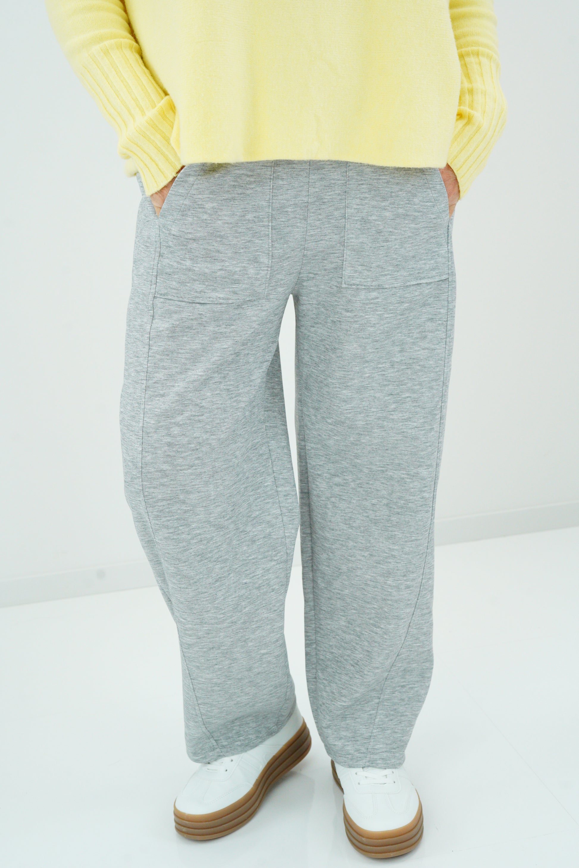Diese Hose in meliertem Hellgrau vereint entspannten Tragekomfort mit urbanem Chic. Die weiche, elastische Viskosemischung sorgt für ein angenehmes Hautgefühl, während die lässige Passform mit schräger Ziernaht und aufgesetzten Taschen einen modernen Look kreiert. Ideal kombinierbar mit Strick, Blusen oder Longshirts – für ein stilvolles Alltags-Outfit mit Wohlfühlfaktor.