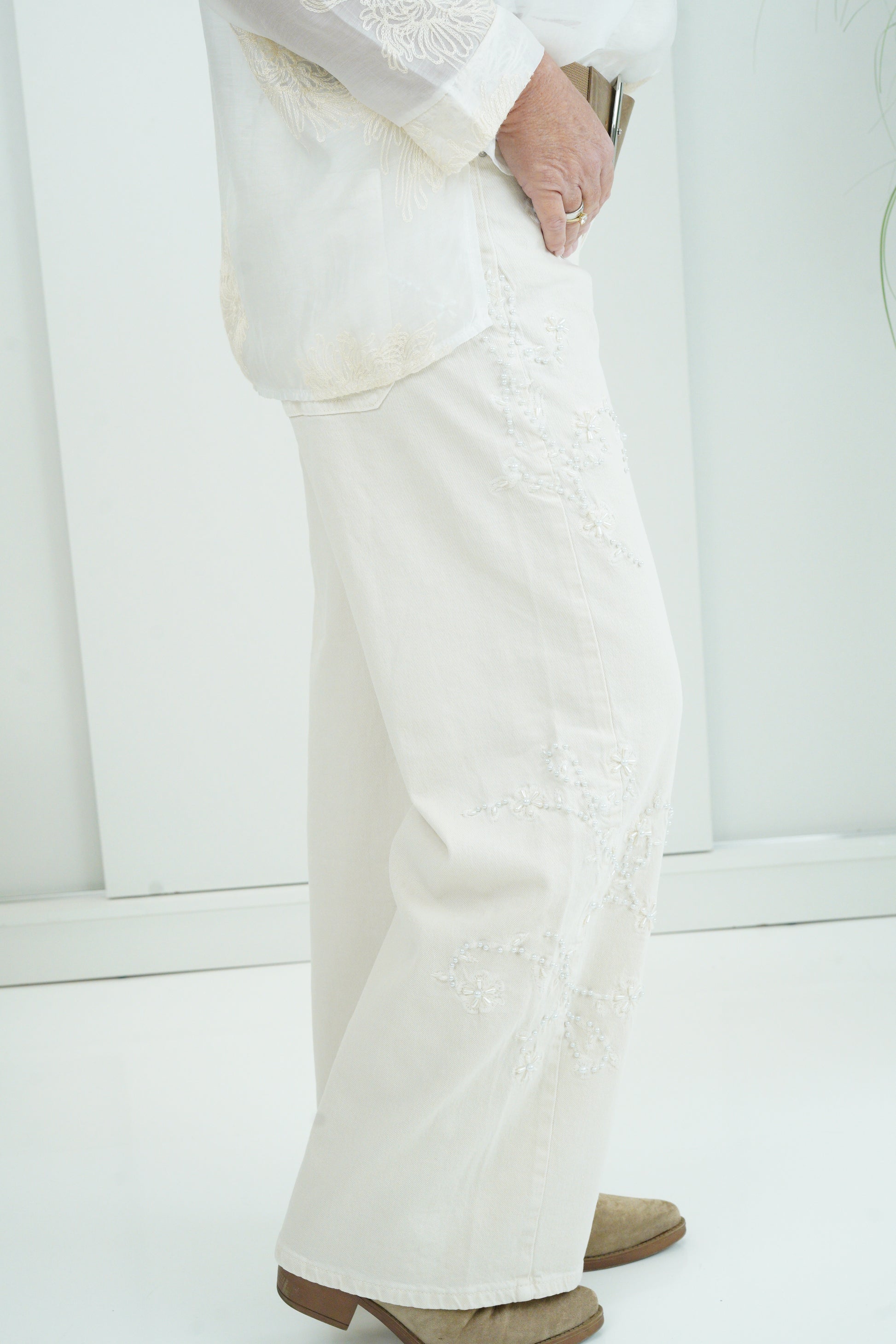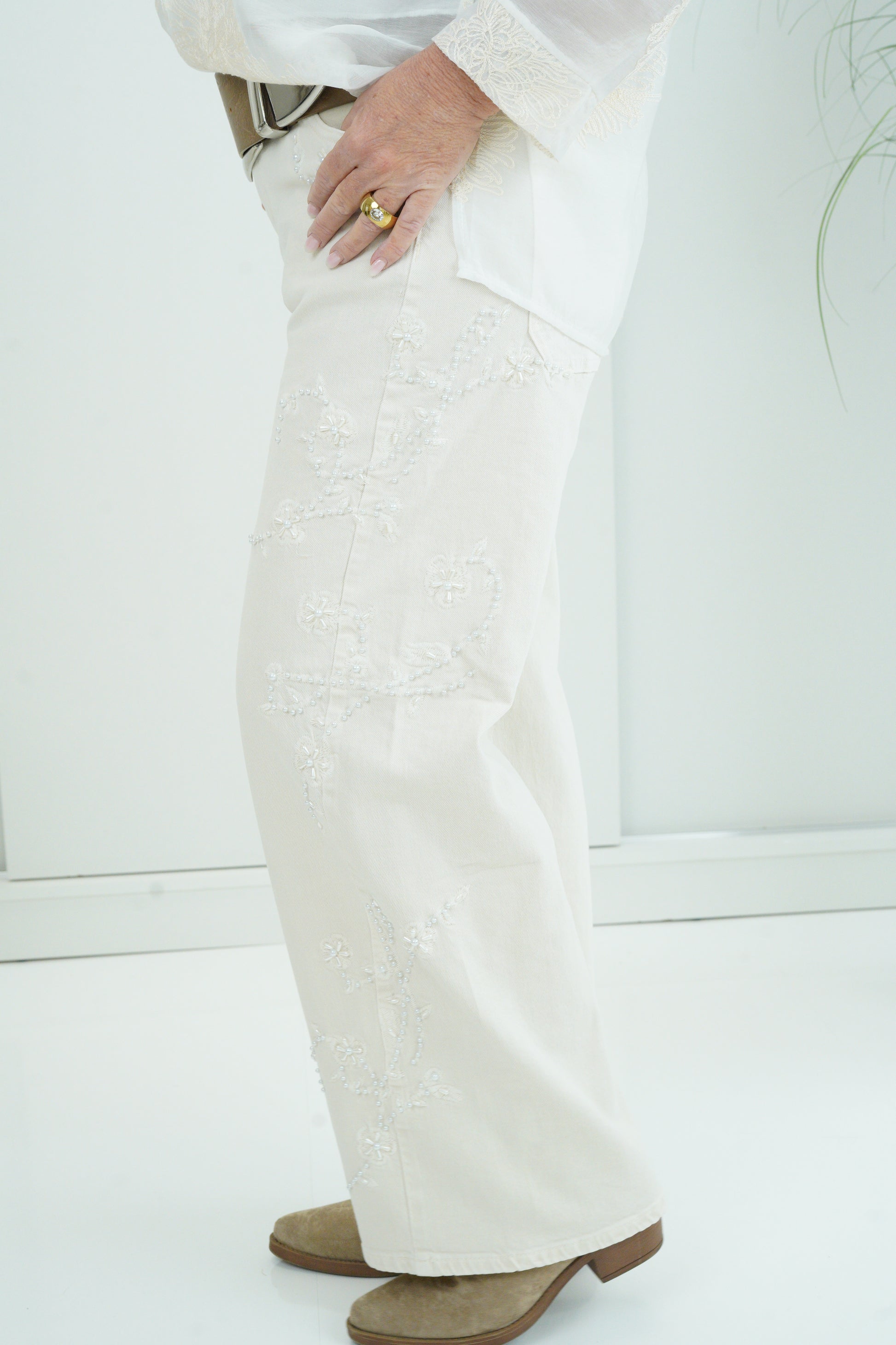 Diese Jeans überzeugt durch ihre moderne, weite Form und die edle Farbgebung in Creme. Der klassische Bund mit Knopf und Zipper sorgt für einen sicheren Sitz, während Eingrifftaschen vorne und aufgesetzte Gesäßtaschen den typischen Denim-Charakter unterstreichen. Das Highlight ist die seitliche Perlenstickerei, die dem Look eine feminine, elegante Note verleiht und die Jeans zu etwas ganz Besonderem macht. Die Materialmischung mit Tencel schenkt ihr einen besonders soften Griff und einen schönen, fließenden Fall.