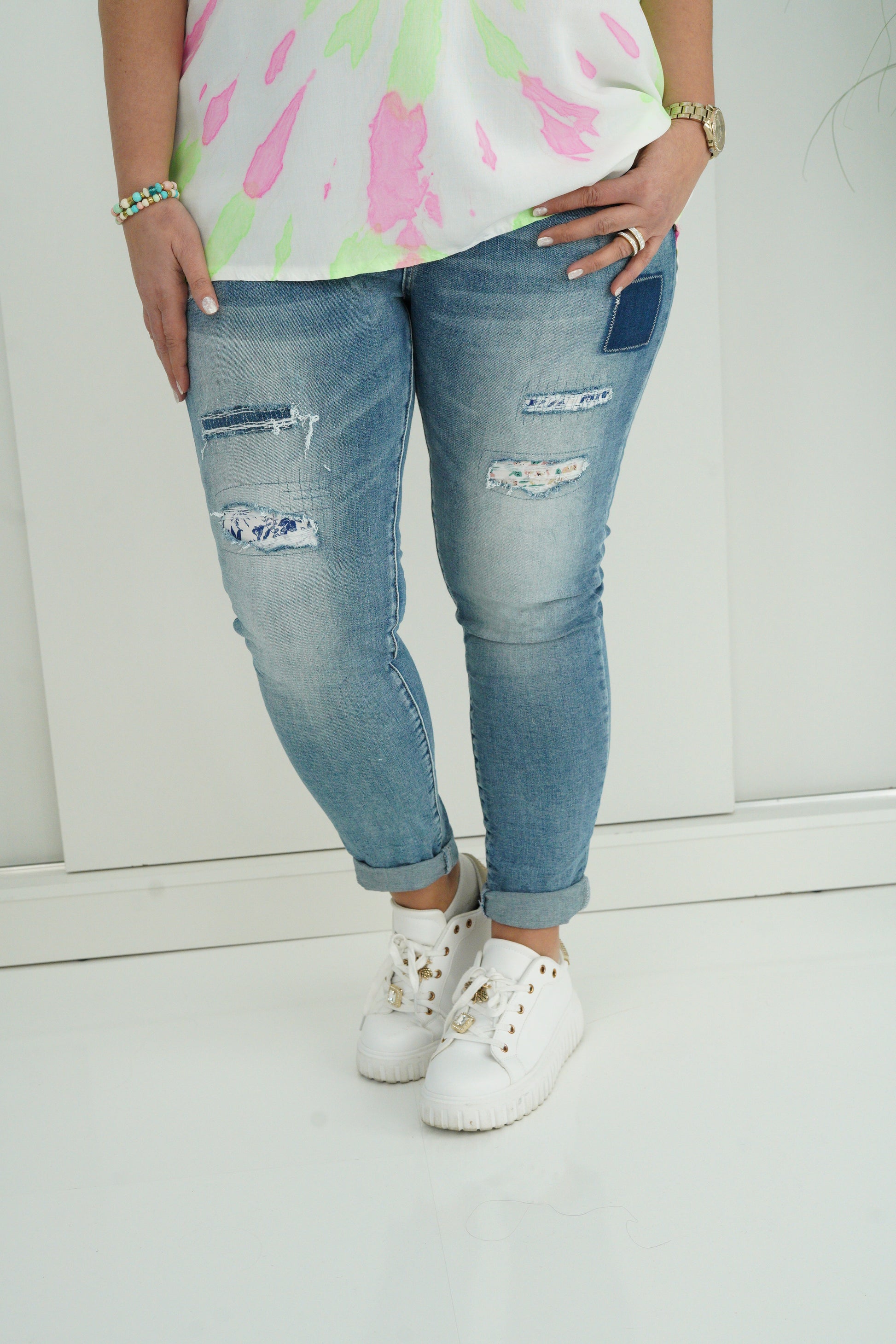 Durch den angenehmen Stretch-Anteil sitzt die Jeans bequem und passt sich der Figur optimal an. Die Kombination aus klassischem Denim-Style und trendigen Used-Details macht sie zu einem vielseitigen Begleiter, der sich sowohl lässig mit Shirts als auch schick mit Blusen oder Strickteilen kombinieren lässt.