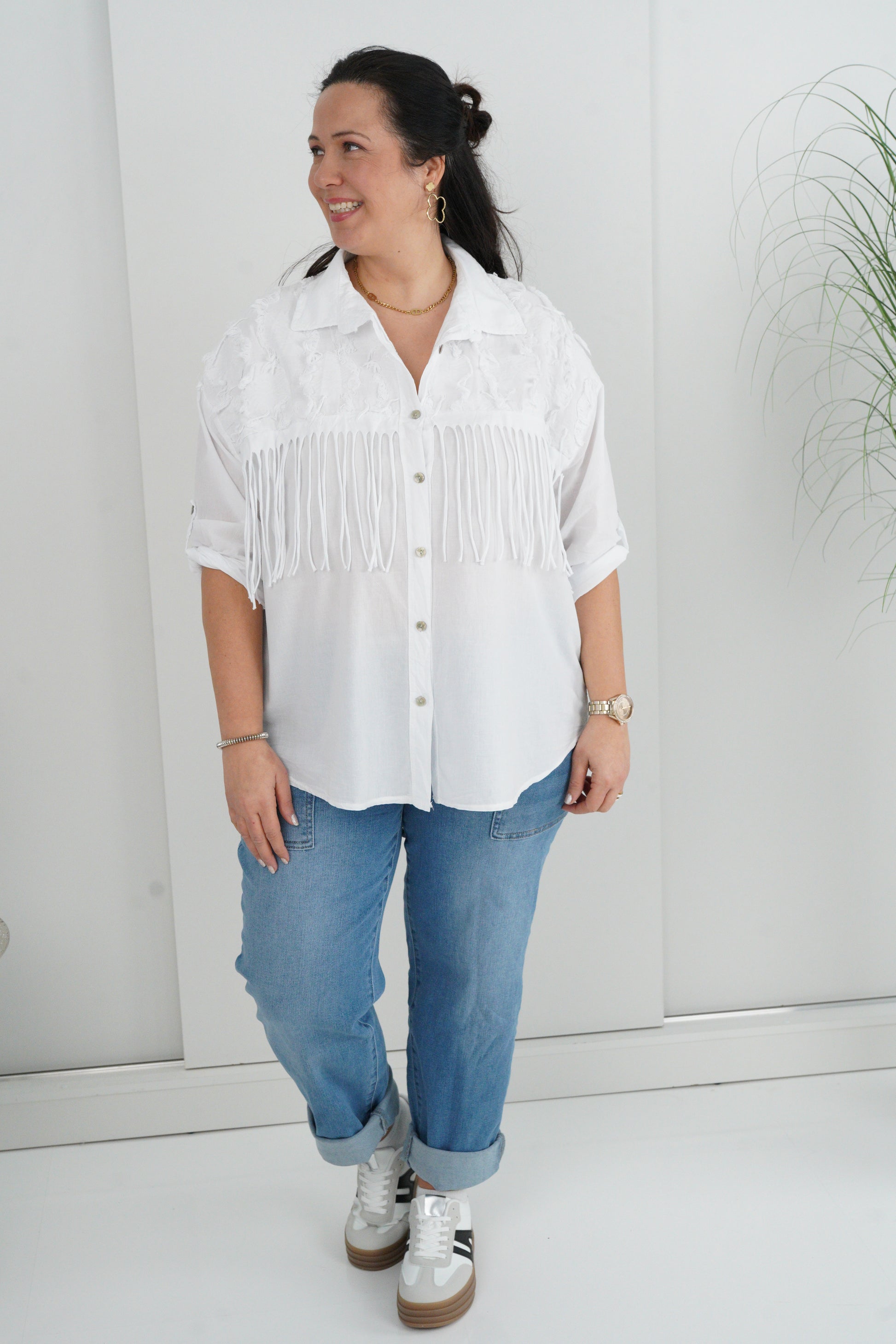 Bluse in Weiß mit Jeans (38-44)