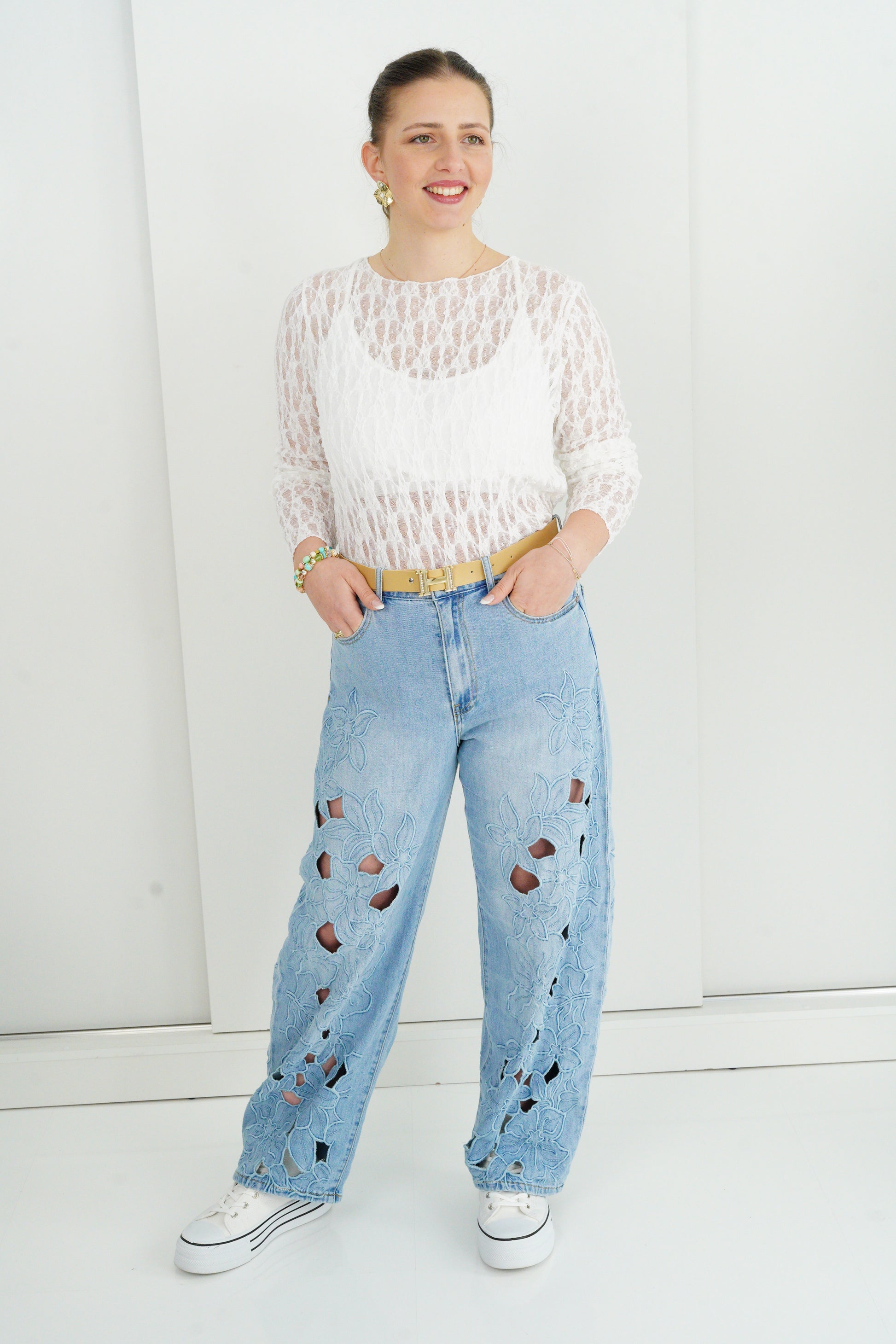 Diese Jeans verbindet lässige Weite mit auffälligen Details und wird so zum echten Hingucker. Die floralen Cut-outs verleihen dem klassischen Denim eine besondere Note, während der angenehme Materialmix und die bequeme Passform für hohen Tragekomfort sorgen. Ideal für moderne Alltagslooks mit individuellem Stil – bequem, trendbewusst und vielseitig kombinierbar.