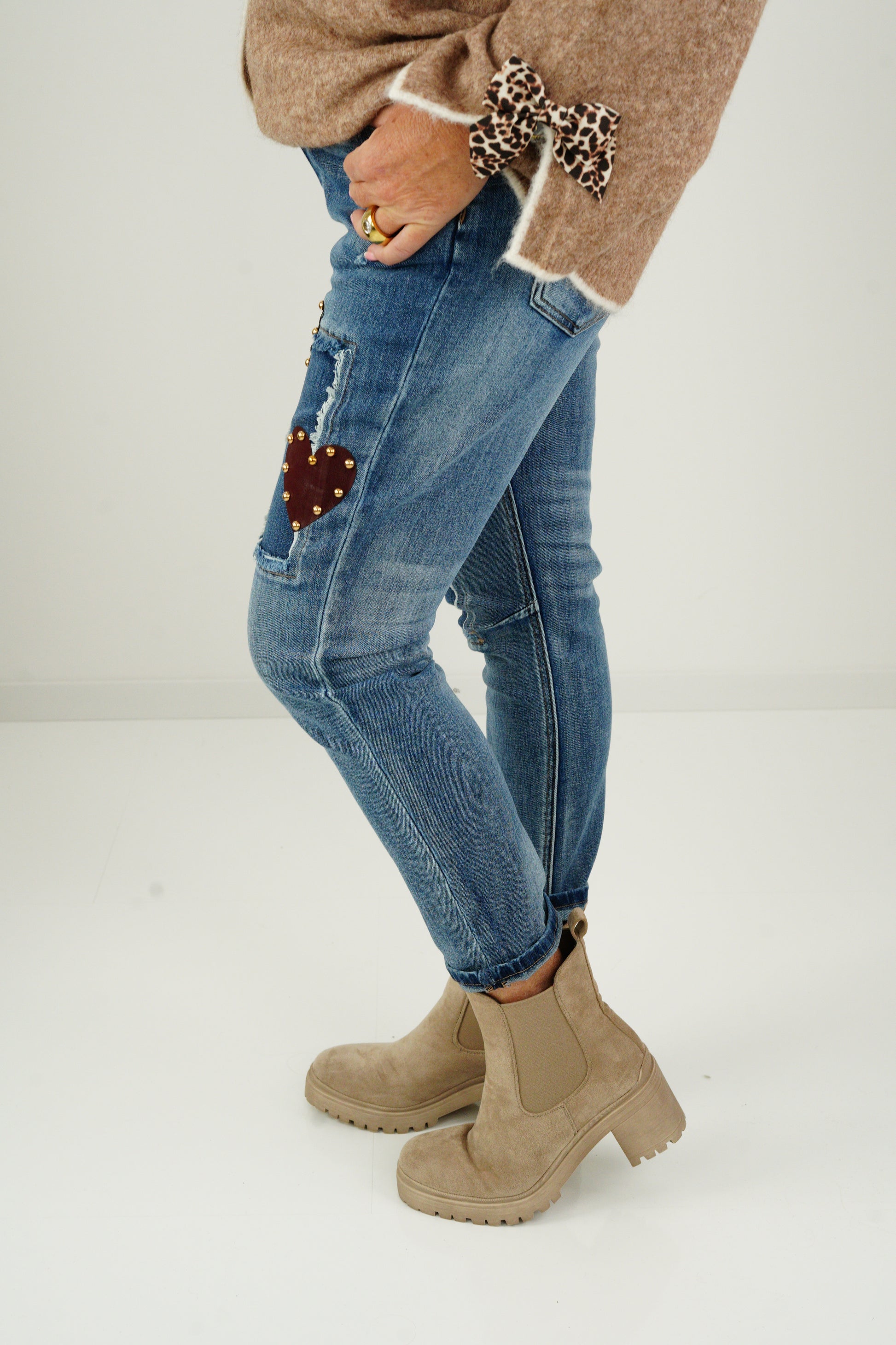 Verziert mit Pailletten, Nieten und Kunstleder-Patches