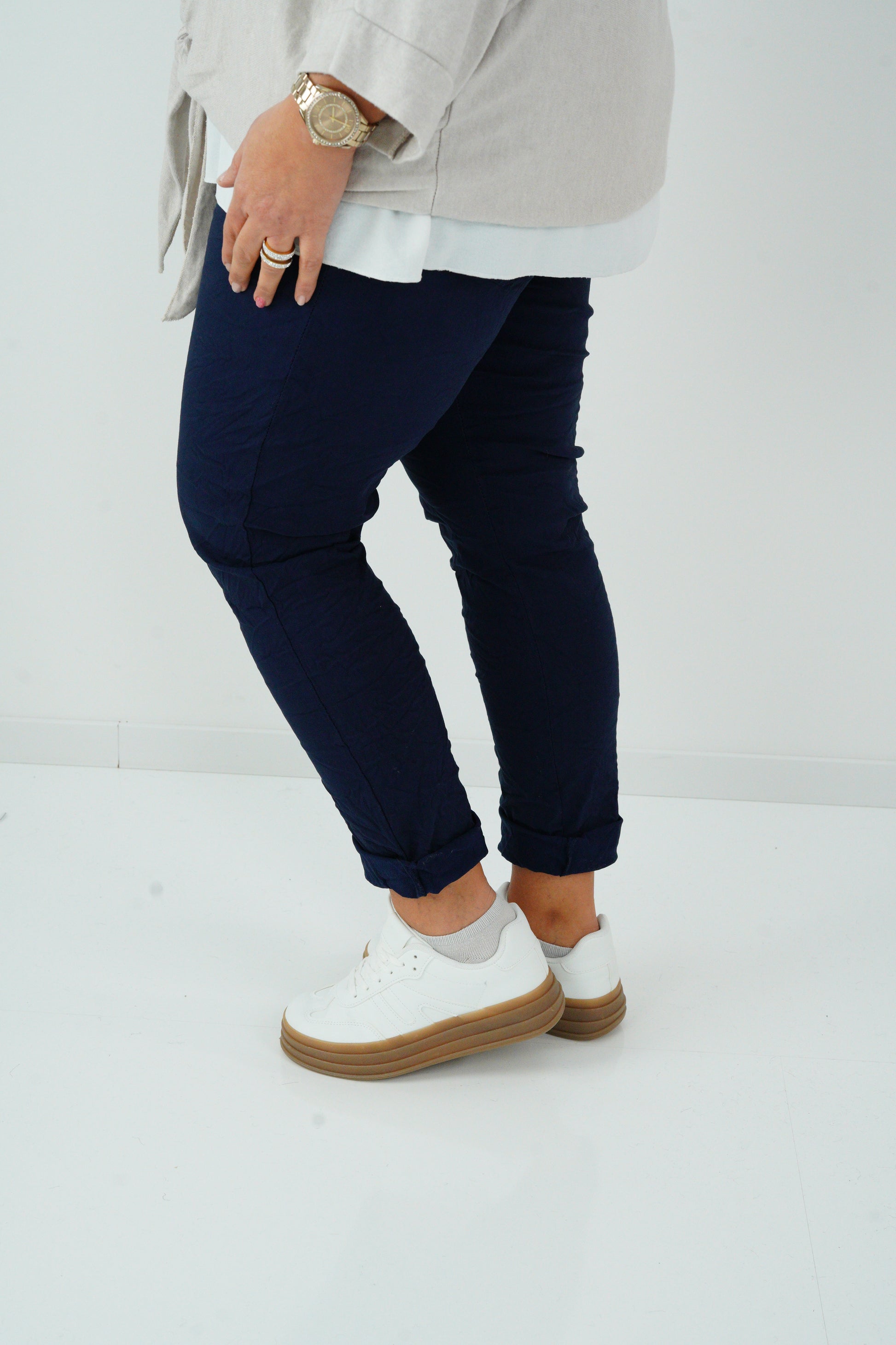 Diese Joggpant in Marine vereint lässigen Komfort mit eleganter Zurückhaltung. Der weiche Viskosestoff schmiegt sich angenehm an, während der Stretch-Anteil für Bewegungsfreiheit sorgt. Dank der neutralen Farbe lässt sich die Hose vielseitig kombinieren – perfekt zu feinen Blusen, lässigen Shirts oder groben Strickteilen. Ein echtes Wohlfühlteil für stilvolle Alltagslooks.