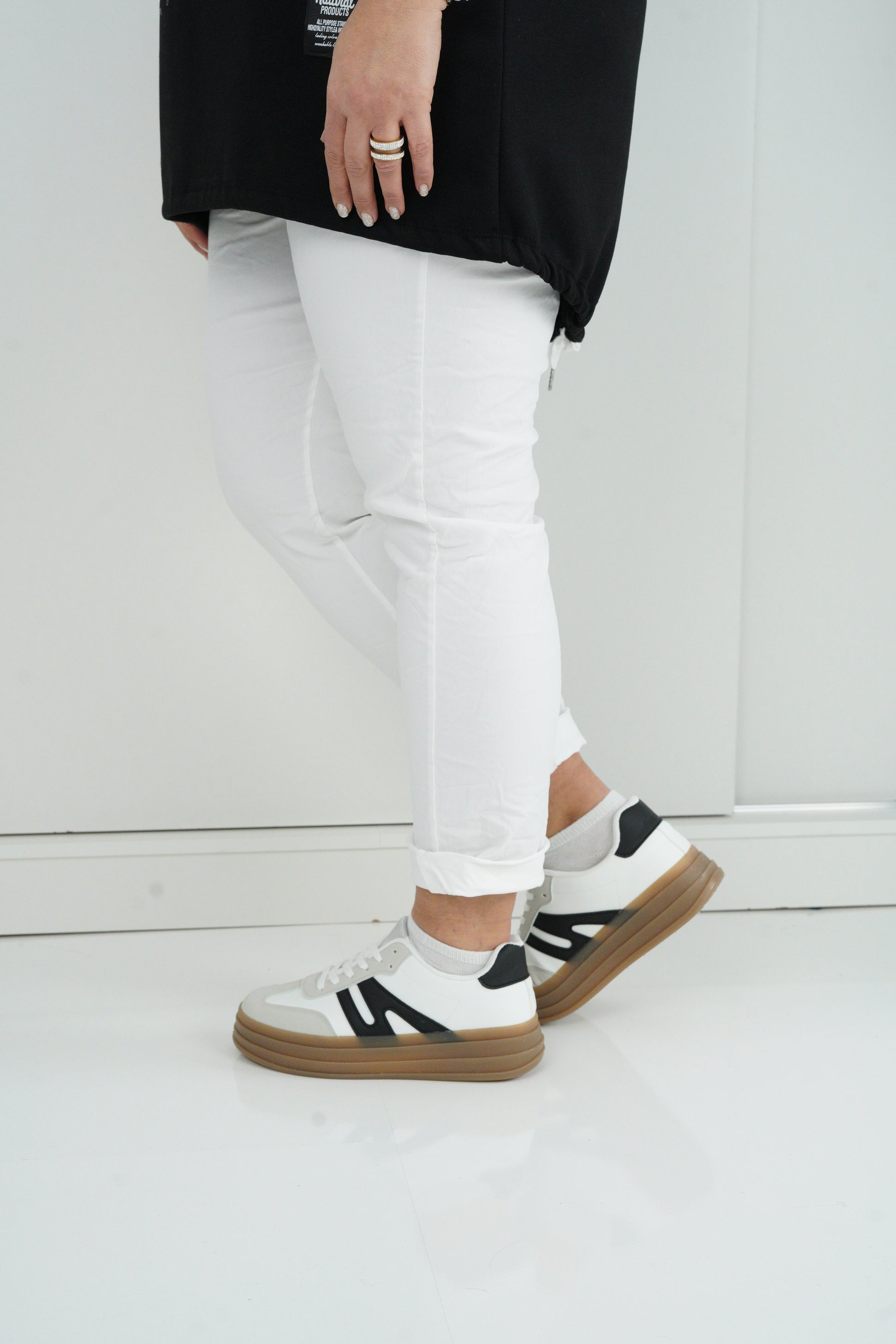 Diese Hose vereint Komfort mit Style – ideal für entspannte Alltagslooks oder gemütliche Stunden zu Hause. Der Weiß-Ton lässt sich wunderbar kombinieren – einfach reinschlüpfen und wohlfühlen.