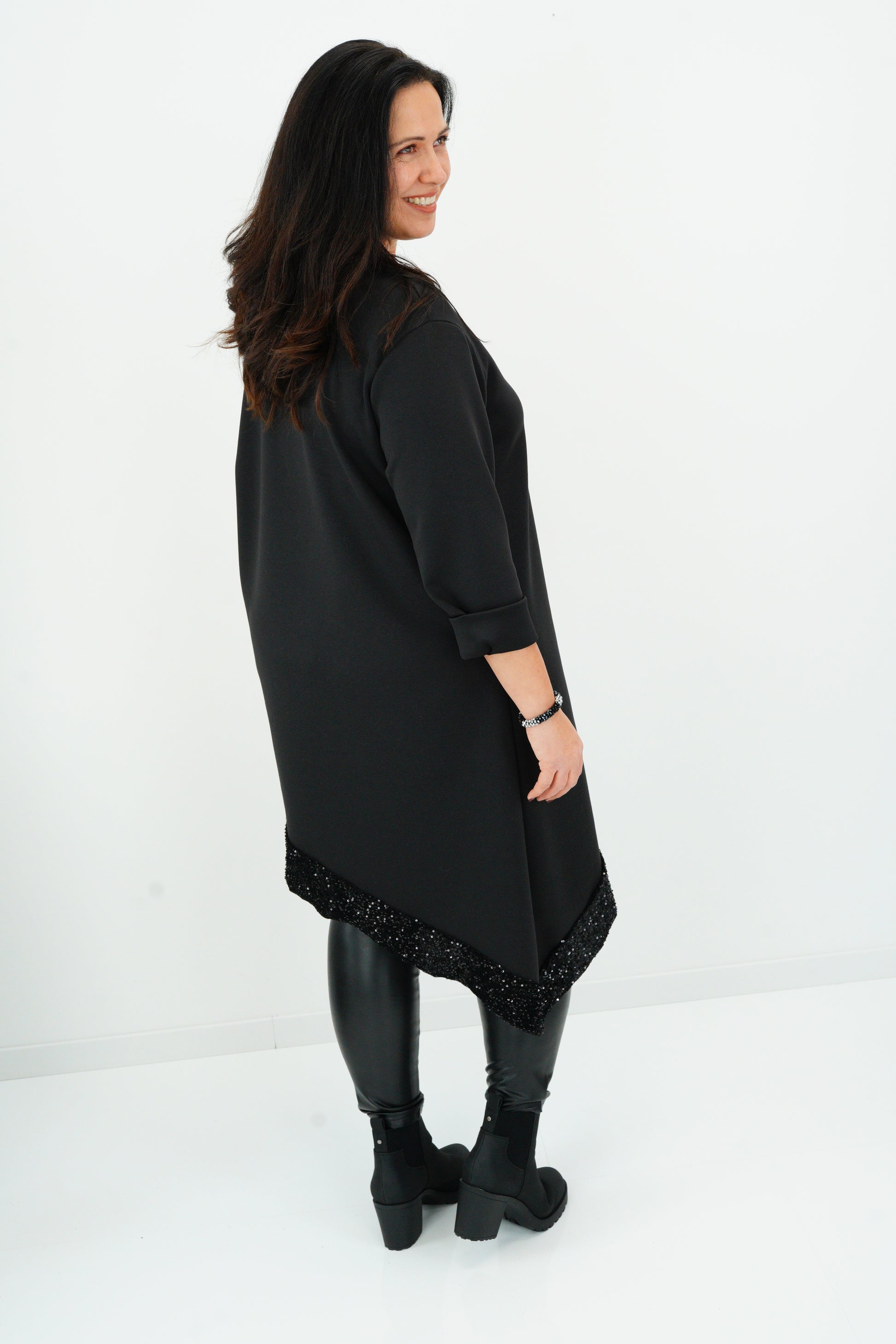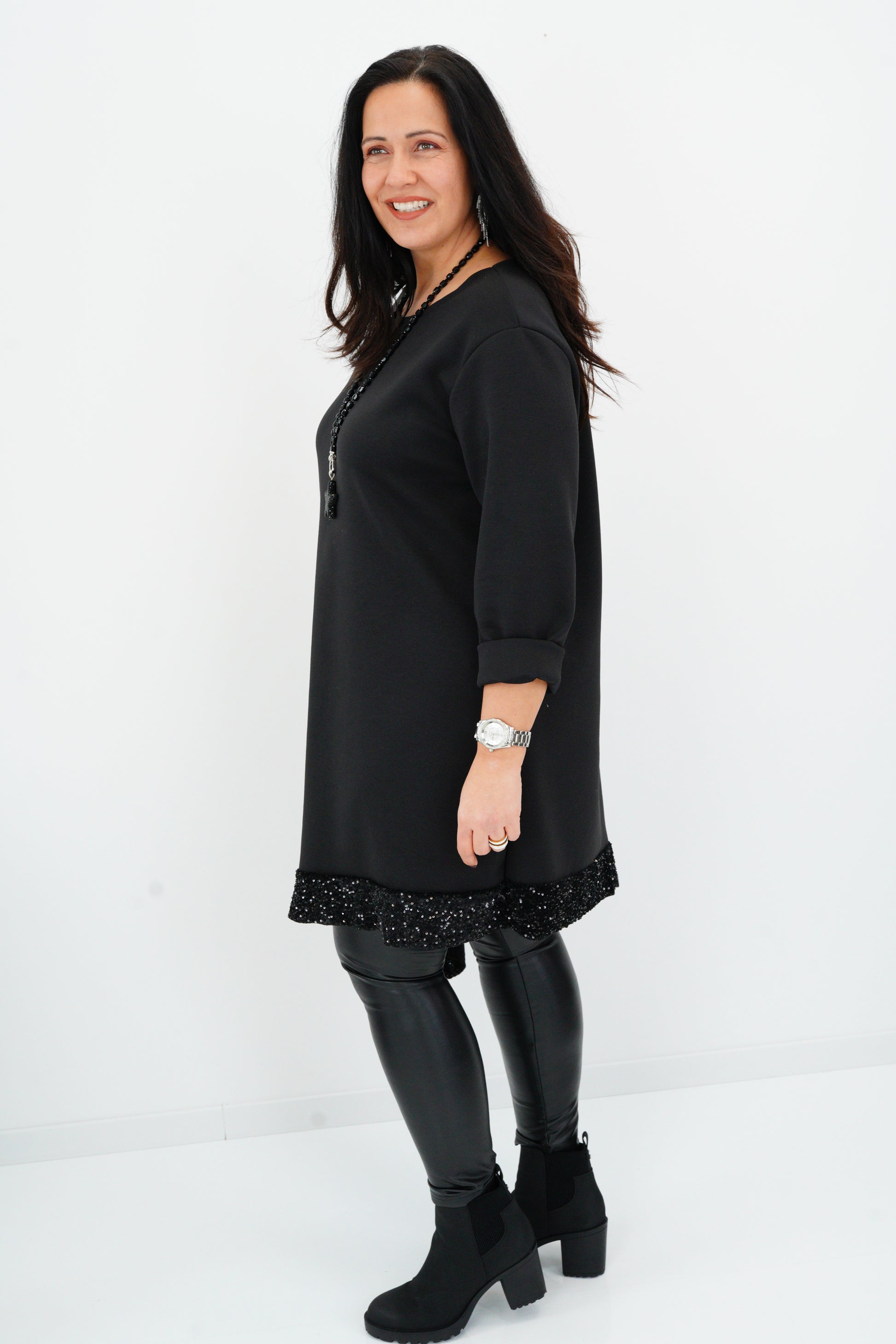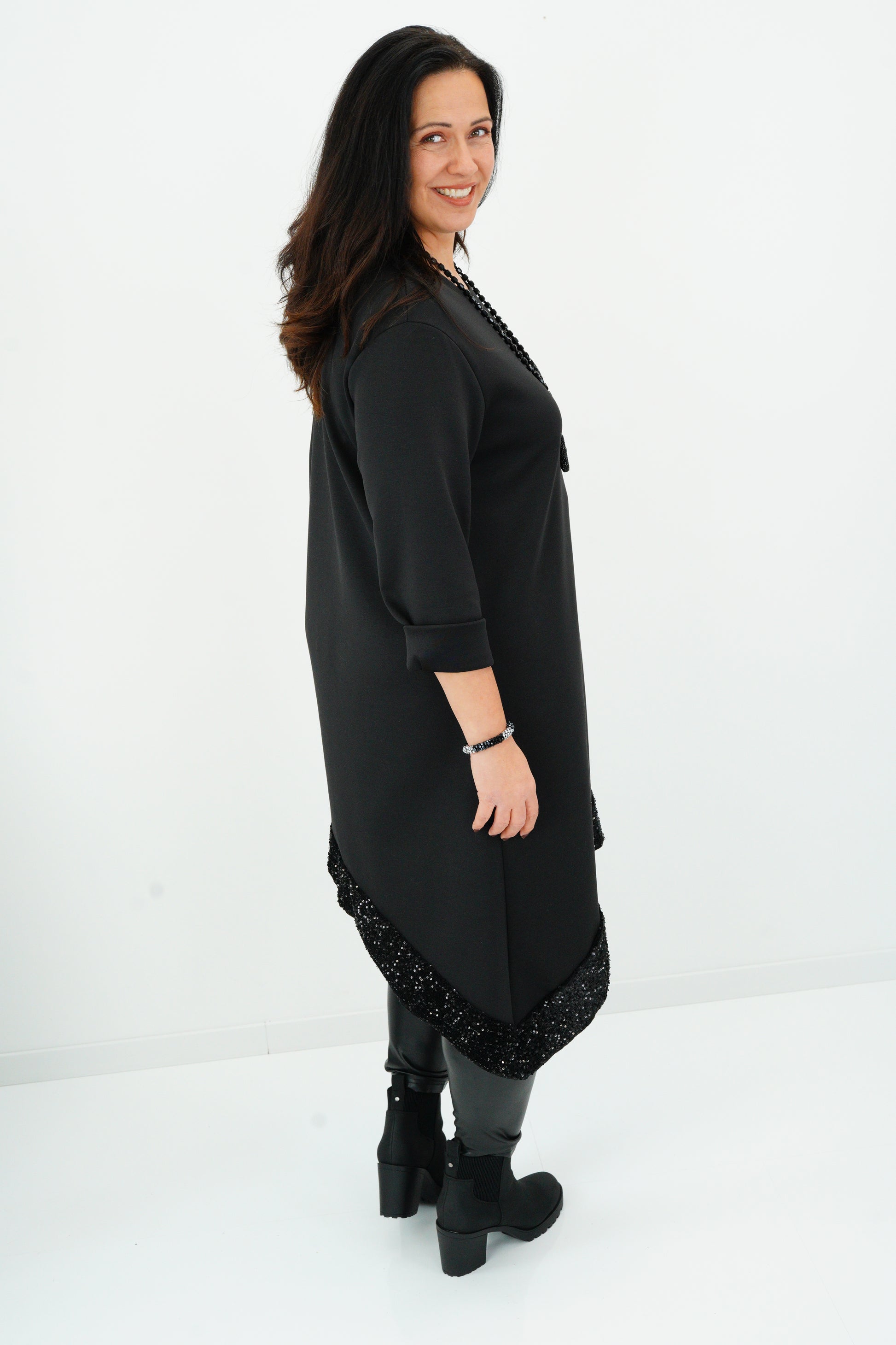 Dieses schwarze Kleid vereint femininen Chic mit einem Hauch Glamour: Der asymmetrische Schnitt sorgt für eine moderne Silhouette, während der feine Paillettenrand dem Look eine elegante Note verleiht. Ein stilvolles Lieblingsstück für Dinner, Feste oder besondere Anlässe – bequem, leicht und gleichzeitig ein echter Hingucker.