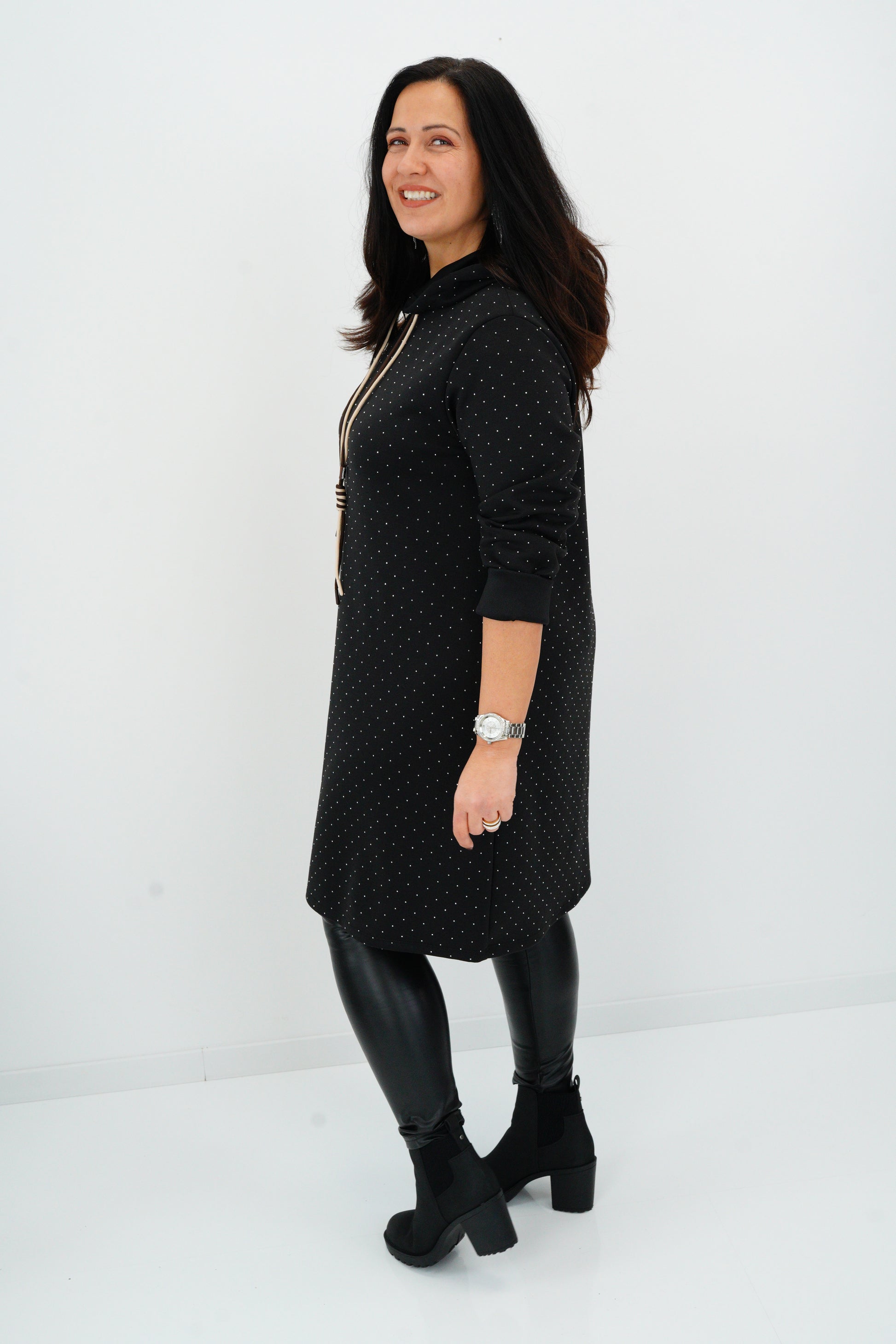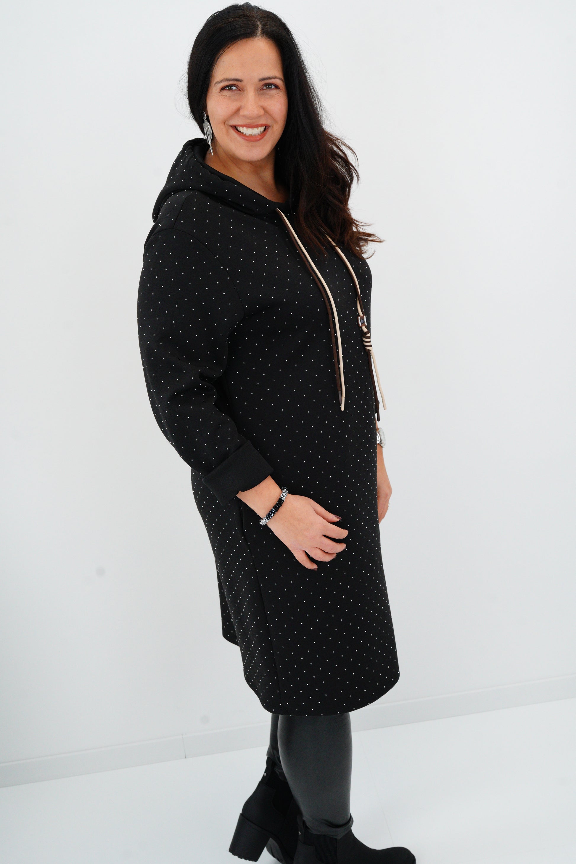 Ein modernes Wohlfühlkleid mit sportivem Twist: Die bequeme Jersey-Qualität trifft auf raffinierte Strass-Highlights und eine lässige Kapuze. Ob für den Alltag, einen Stadtbummel oder gemütliche Abende – dieses Kleid sorgt für einen stilsicheren Auftritt mit dem gewissen Etwas.