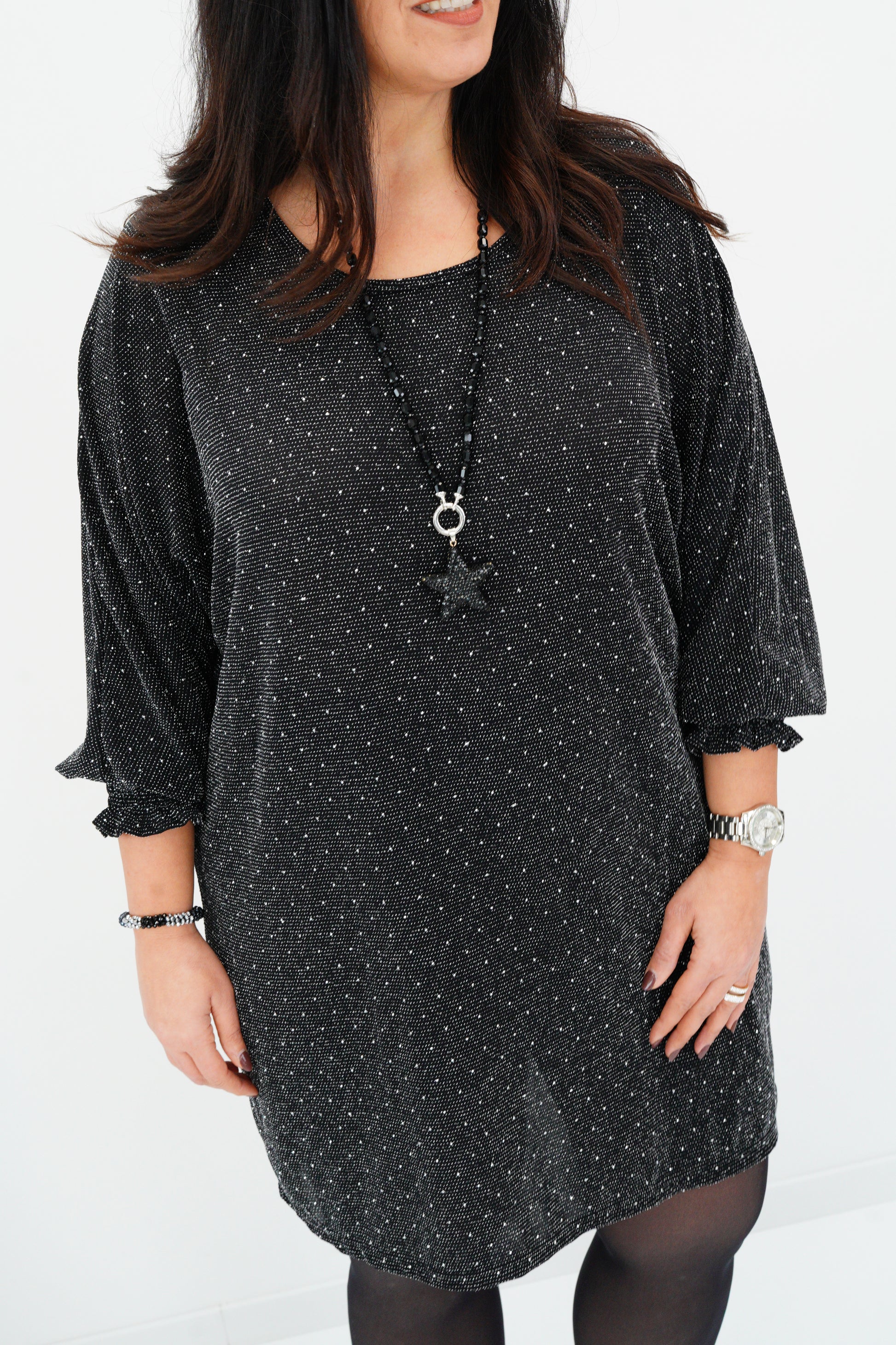 Dieses Kleid ist ein echter Stil-Allrounder: Elegant durch feine Glitzerakzente, bequem dank elastischem Material – und mit den gesmokten Ärmeln ein modisches Statement. Ob zu besonderen Anlässen oder als schickes Everyday-Piece – dieses Kleid sorgt immer für einen glänzenden Auftritt. Kombinierbar mit Boots, Heels oder einer langen Strickjacke für deinen ganz persönlichen Stilbruch.