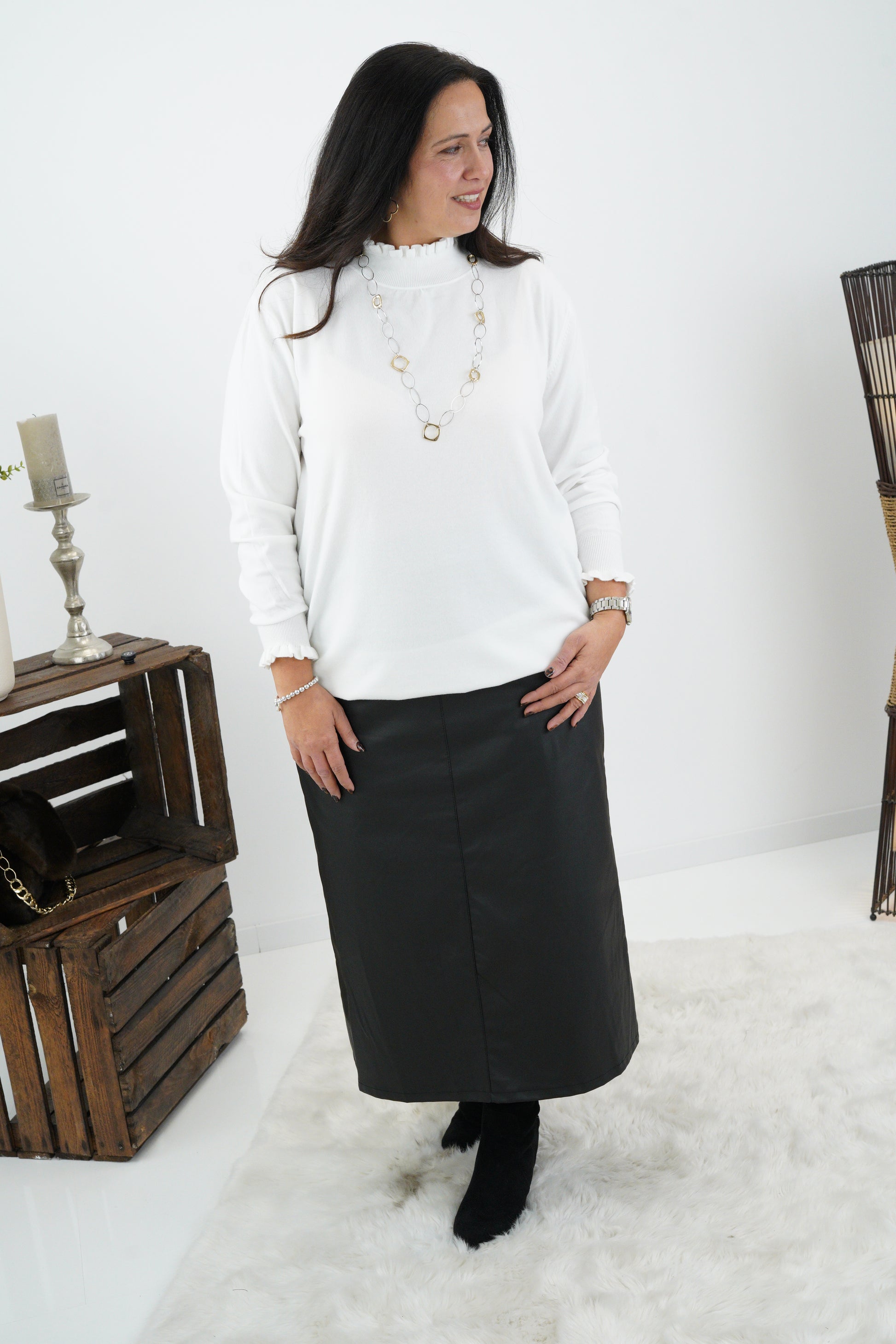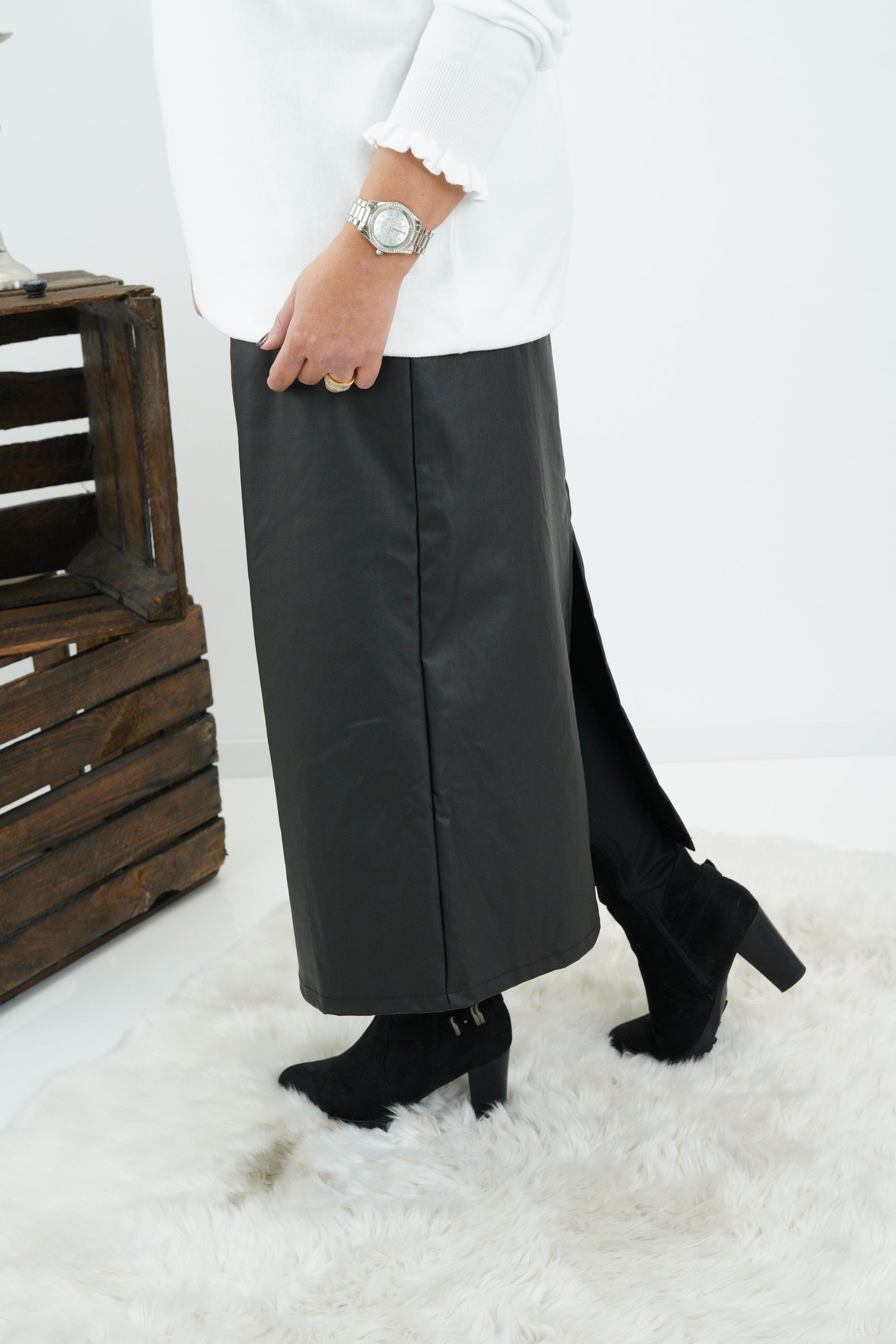Dieser Kunstleder-Rock kombiniert lässigen Chic mit Komfort. Der elegante Schnitt mit Schlitz und Taschen macht ihn zum vielseitigen Begleiter für moderne Looks – ob mit Bluse, Shirt oder Strick. Ideal für stilbewusste Frauen mit Mut zur Aussage.