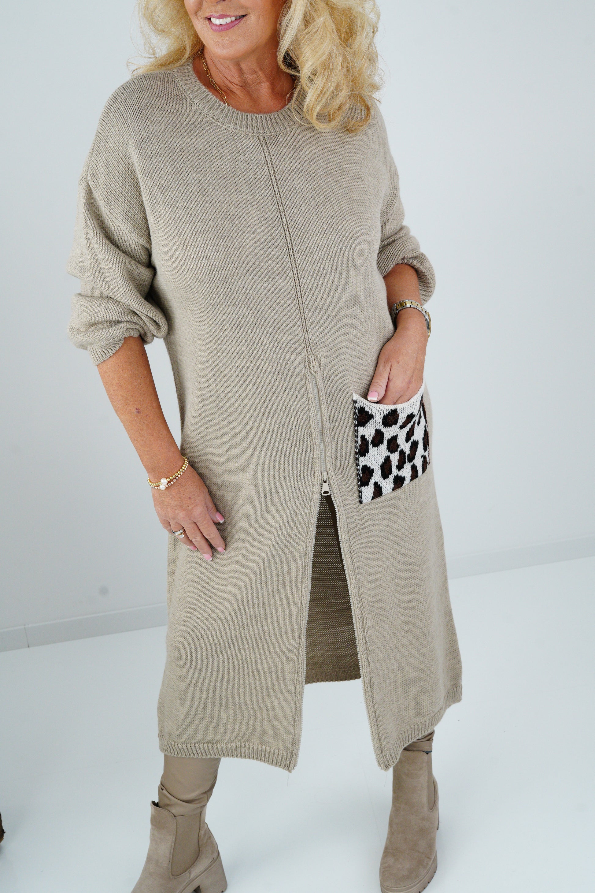 Ein extralanger, gemütlicher Pullover mit raffiniertem Zipper-Detail für flexible Stylings – ob geschlossen als Kleid oder leicht geöffnet über Leggings getragen. Ideal für lässige Everyday-Looks mit besonderem Twist.