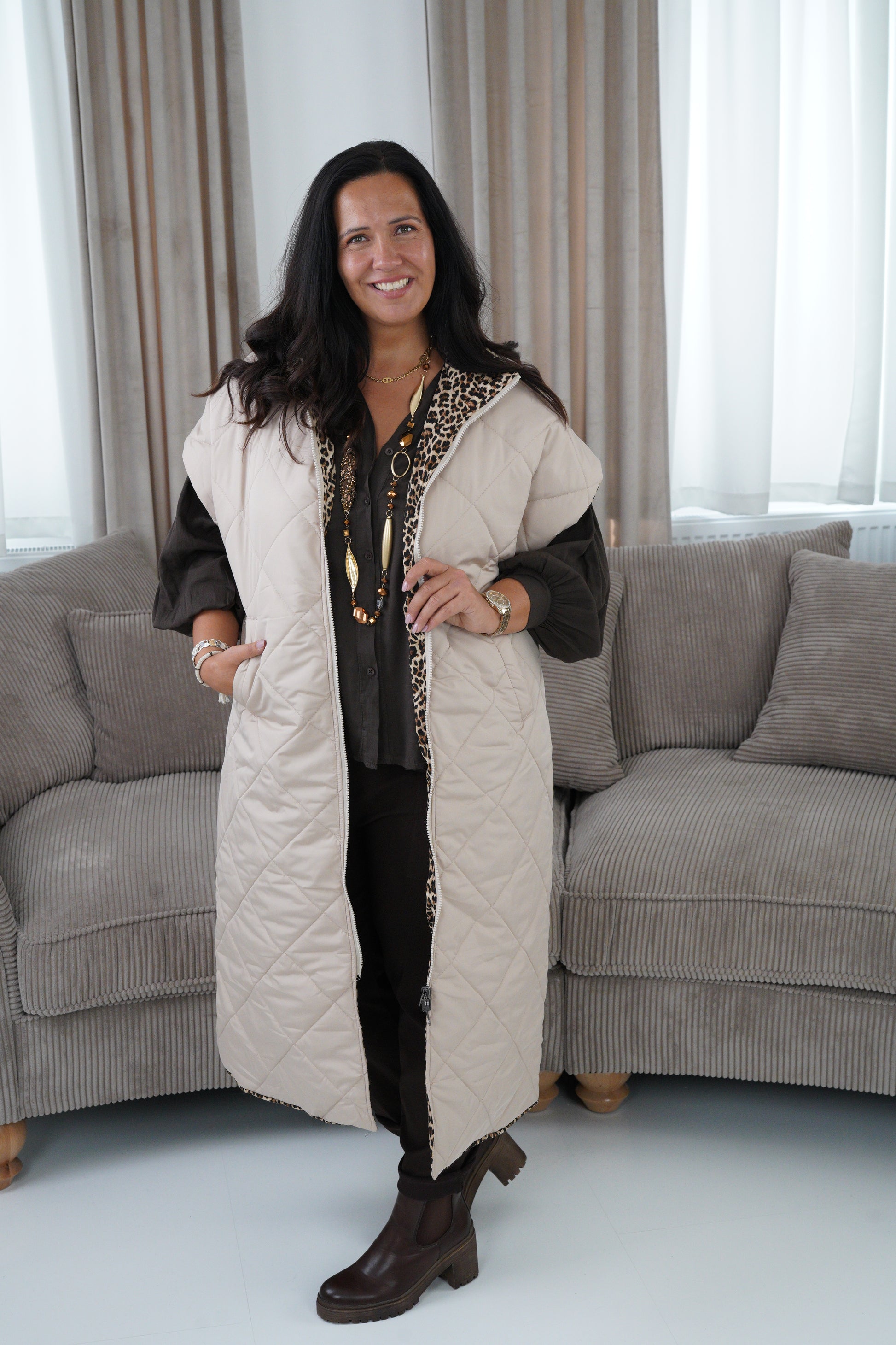 Diese Longline-Weste ist ein echtes Statement-Piece für die Übergangszeit! Außen schlicht und modern, innen mit wildem Leo-Muster – ideal für Lagenlooks mit Stil, Komfort und einem Hauch Extravaganz.