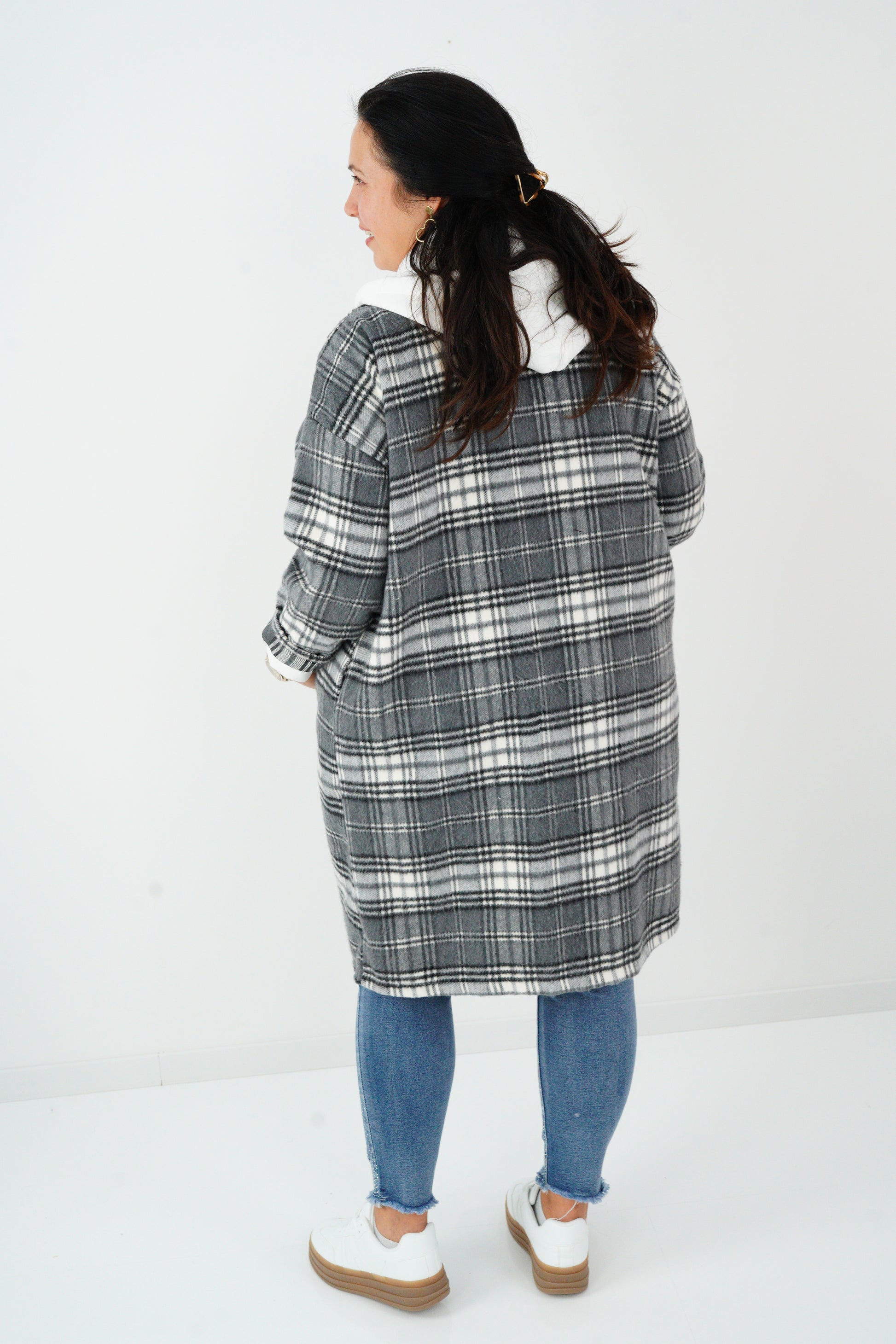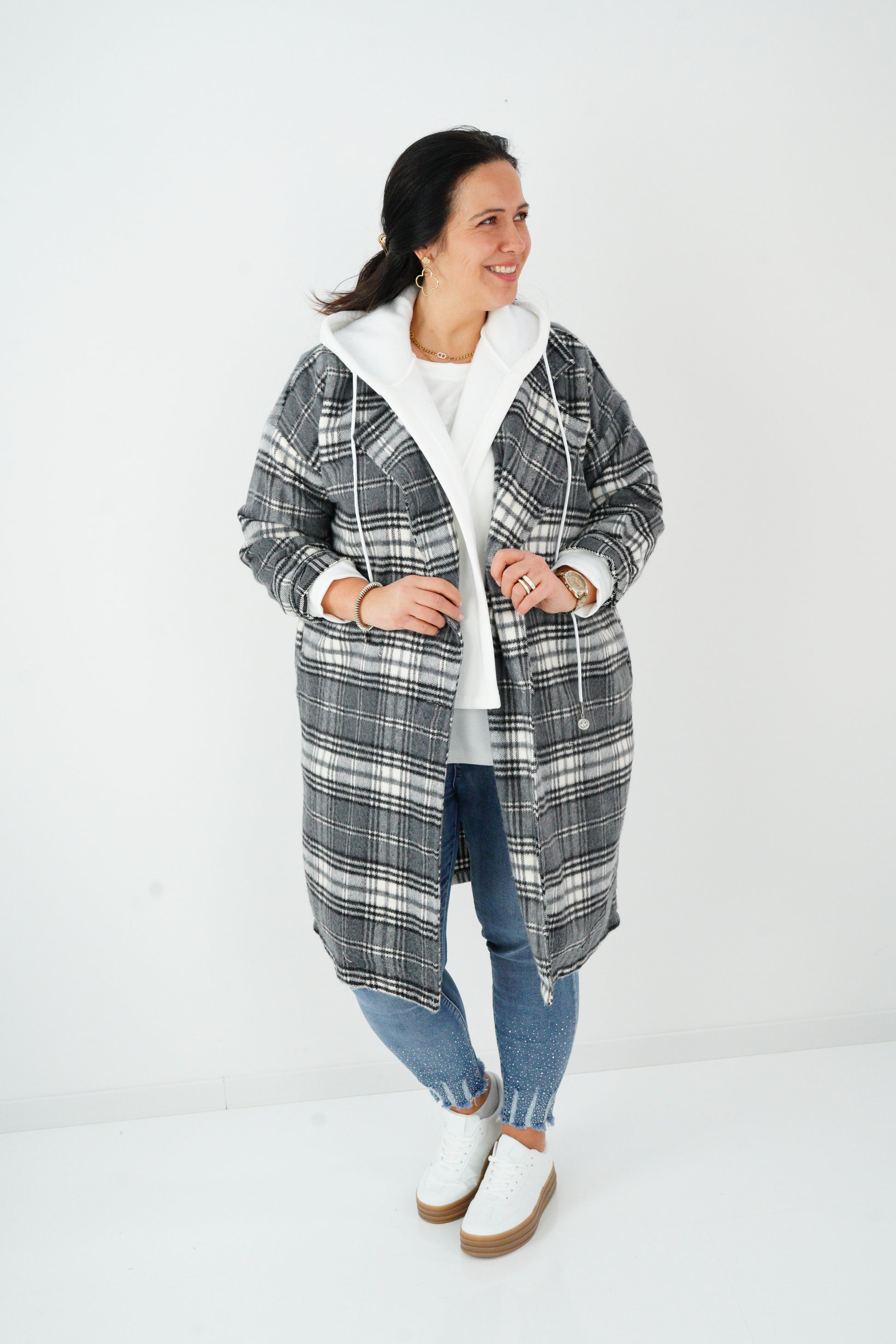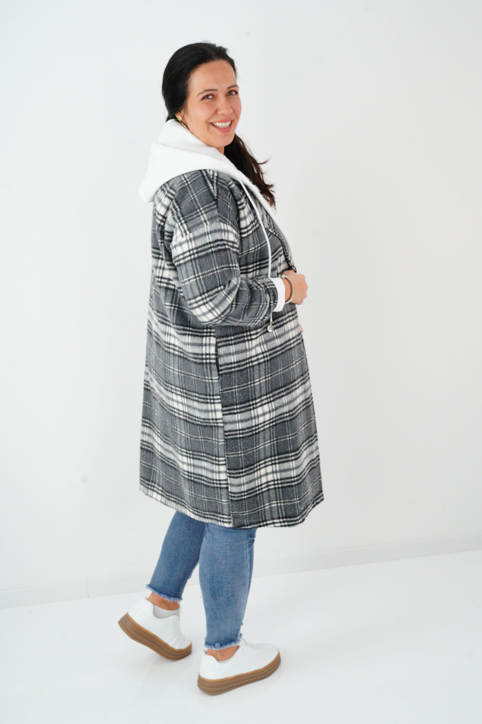 Mantel in Grau-Weiß-Kariert mit Sweateinsatz & Kapuze (Gr. 40–44)