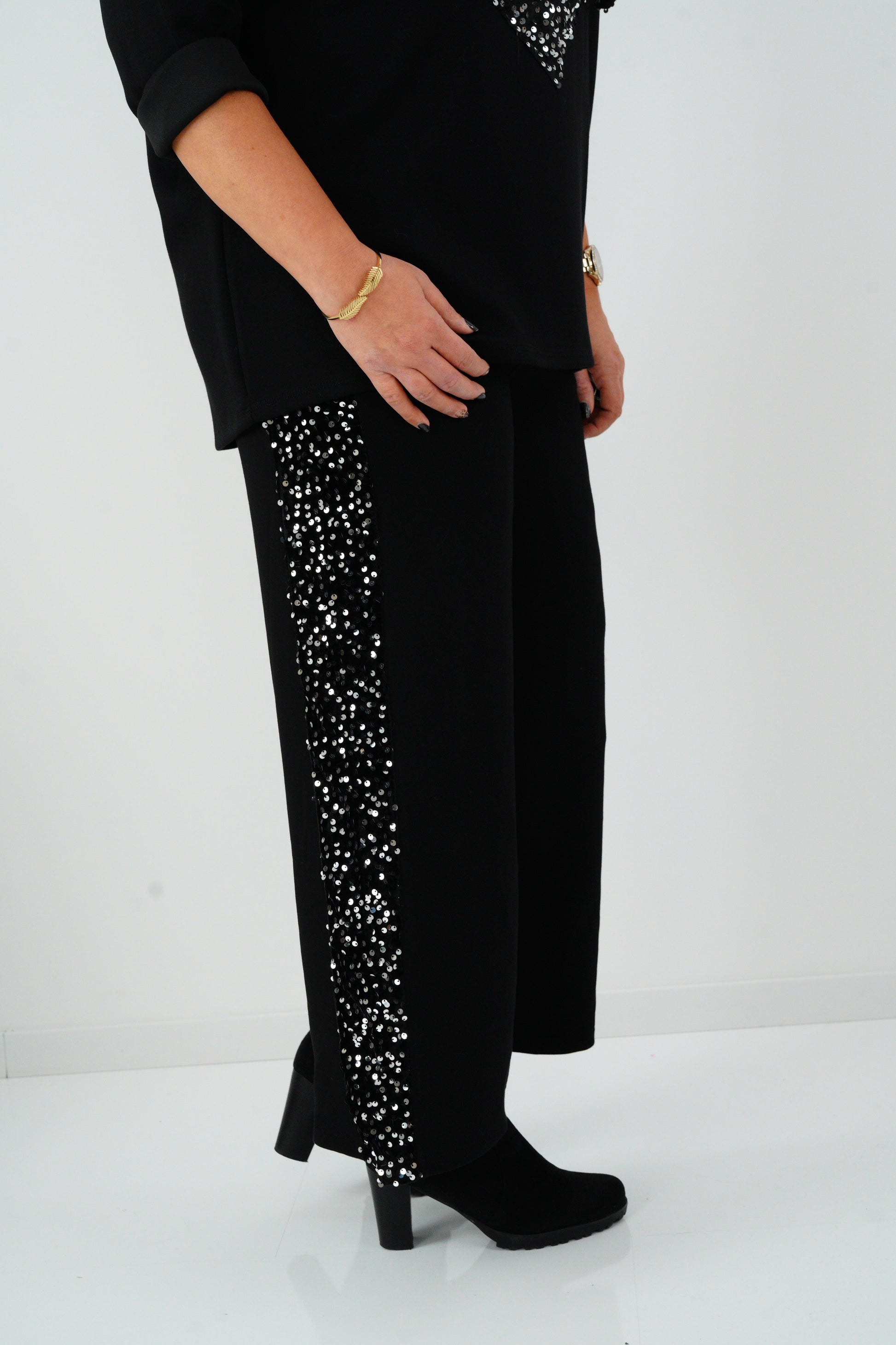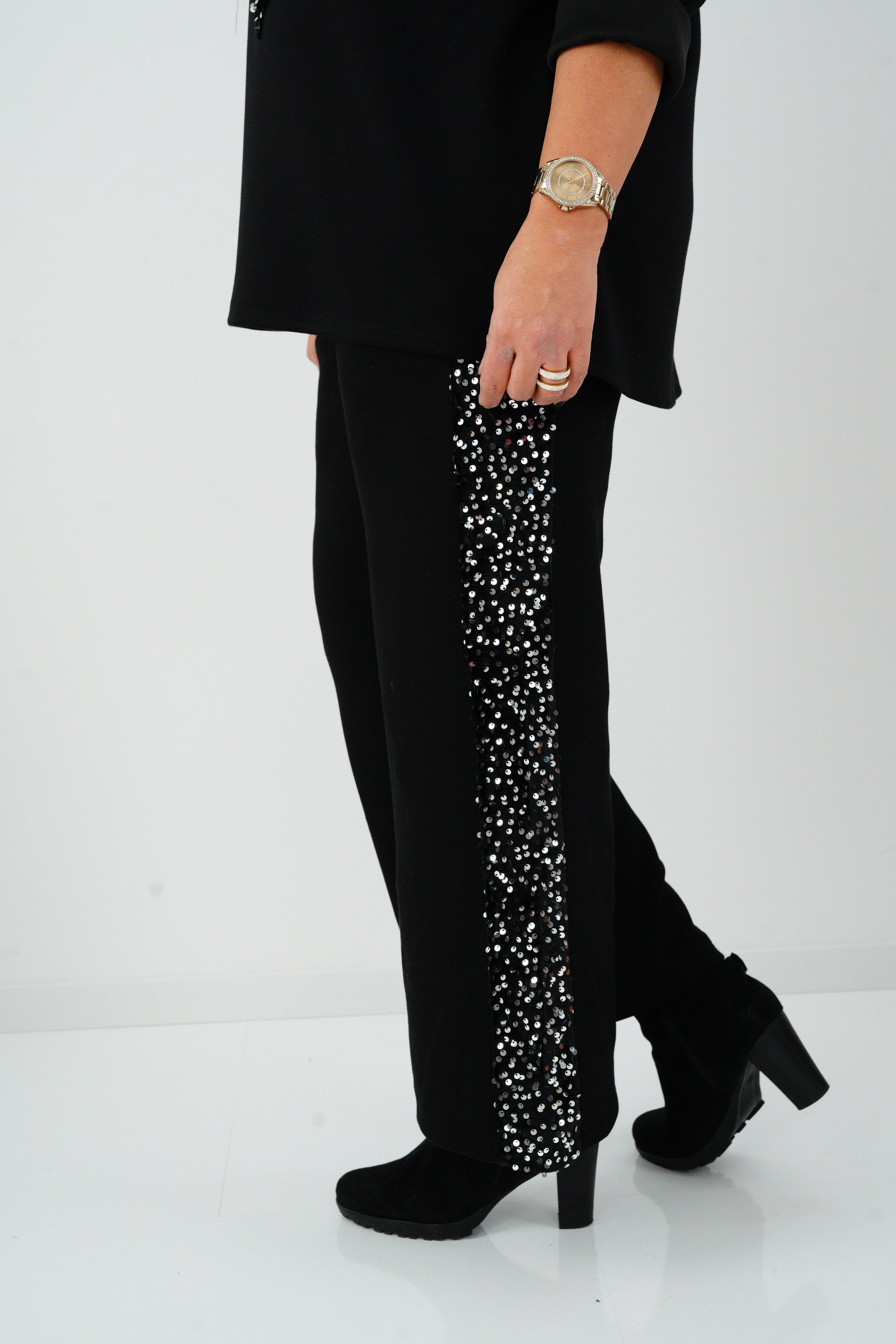 Die perfekte Kombination aus Komfort und Glamour: Diese weiche Marlenehose mit dehnbarem Bund und schimmernden Gallonstreifen ist ein echter Hingucker. Der fließende Stoff und die klassische Beinweite sorgen für eine feminine Silhouette – ideal für Alltag, Büro oder den besonderen Anlass.