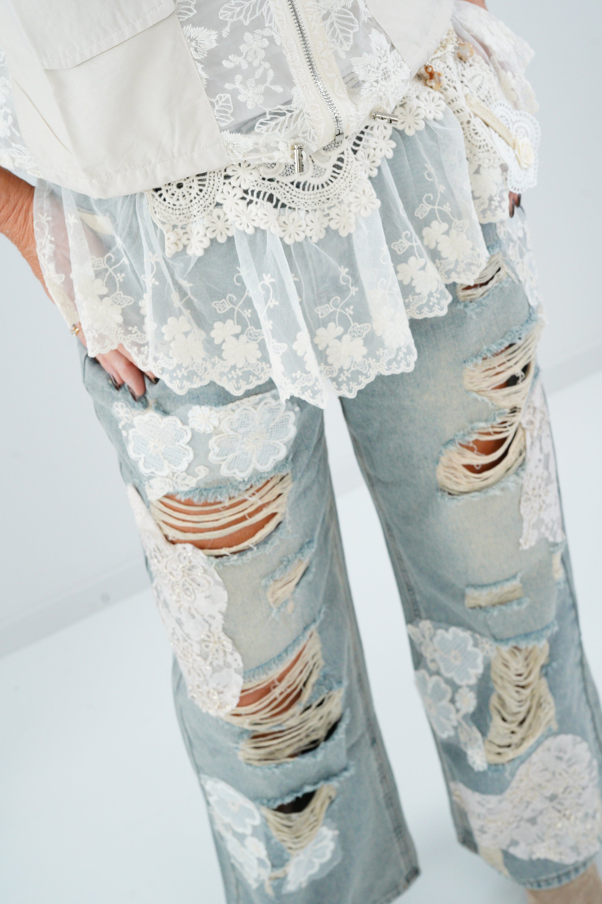 Diese Jeans kombiniert einen klassischen Marlene-Stil mit liebevollen Details: Die Applikationen und der Spitzen-Gürtel setzen modische Highlights, während der bequeme Schnitt für angenehmen Sitz sorgt. Ideal zu femininen Blusen, Strickpullis oder schlichten Basic-Shirts – ein echter Hingucker im Alltag.