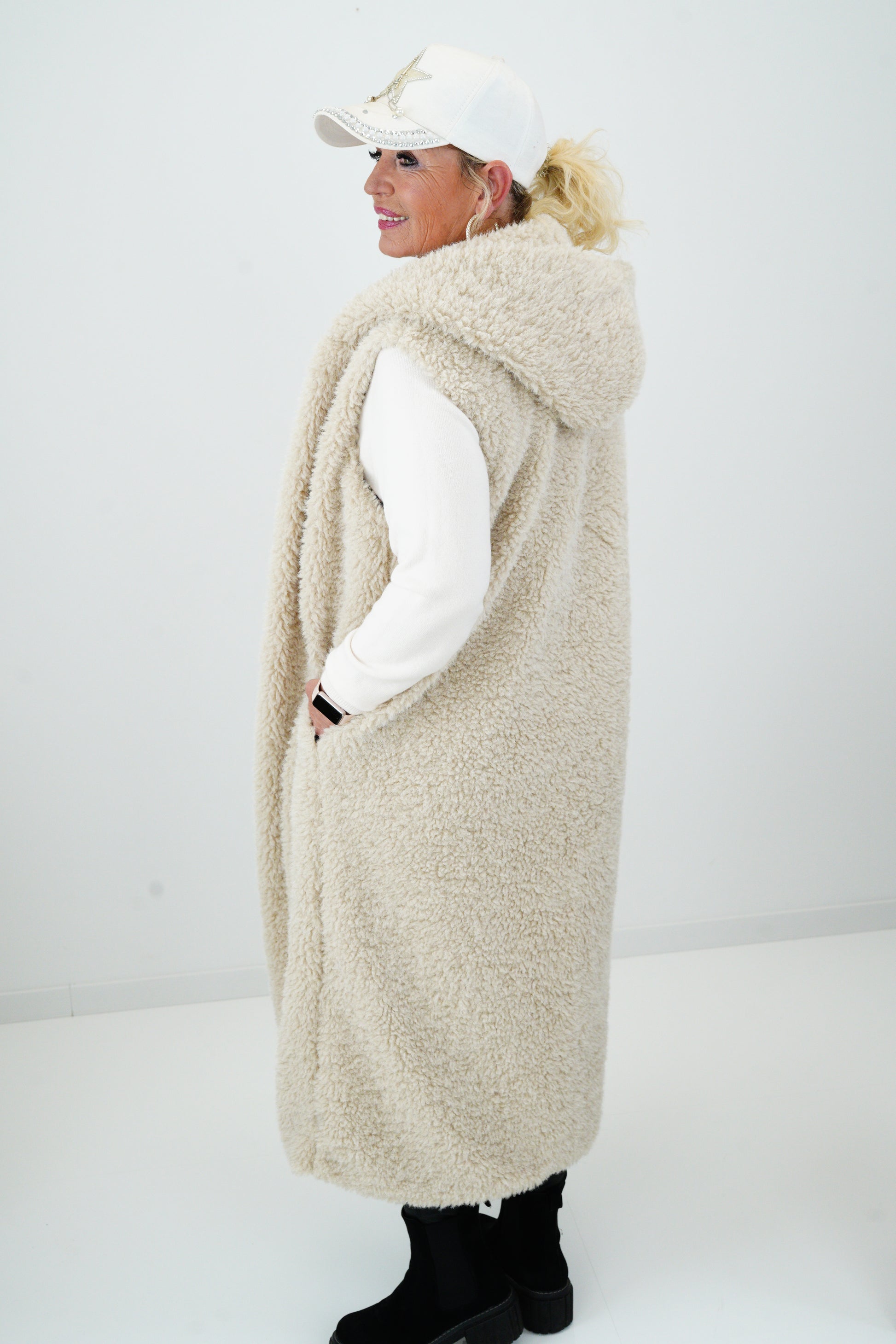 Diese kuschelige Longweste kombiniert Trend und Komfort: außen softes Plüsch, innen angesagter Leo-Look. Ideal für den Layering-Style – über Longsleeve, Strick oder Sweater. Wärmend, stylisch, ein echtes Statement-Piece für kühlere Tage.