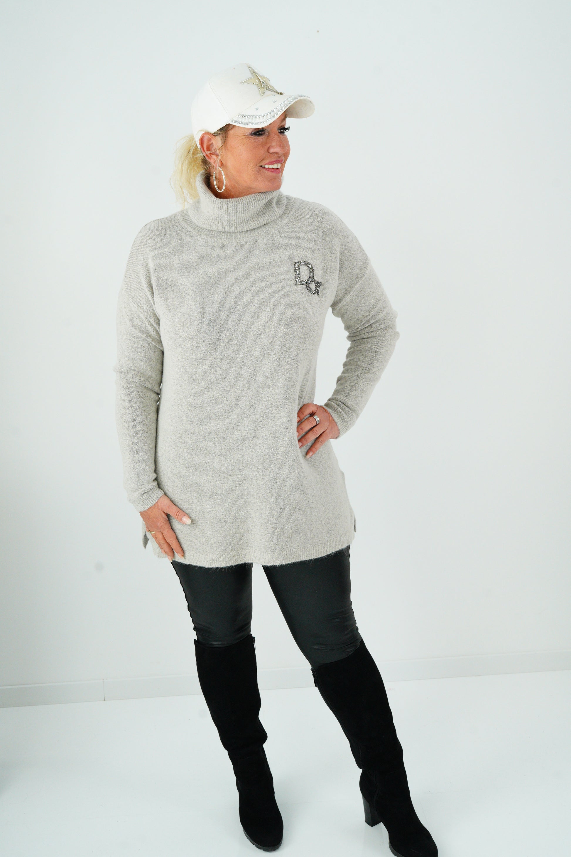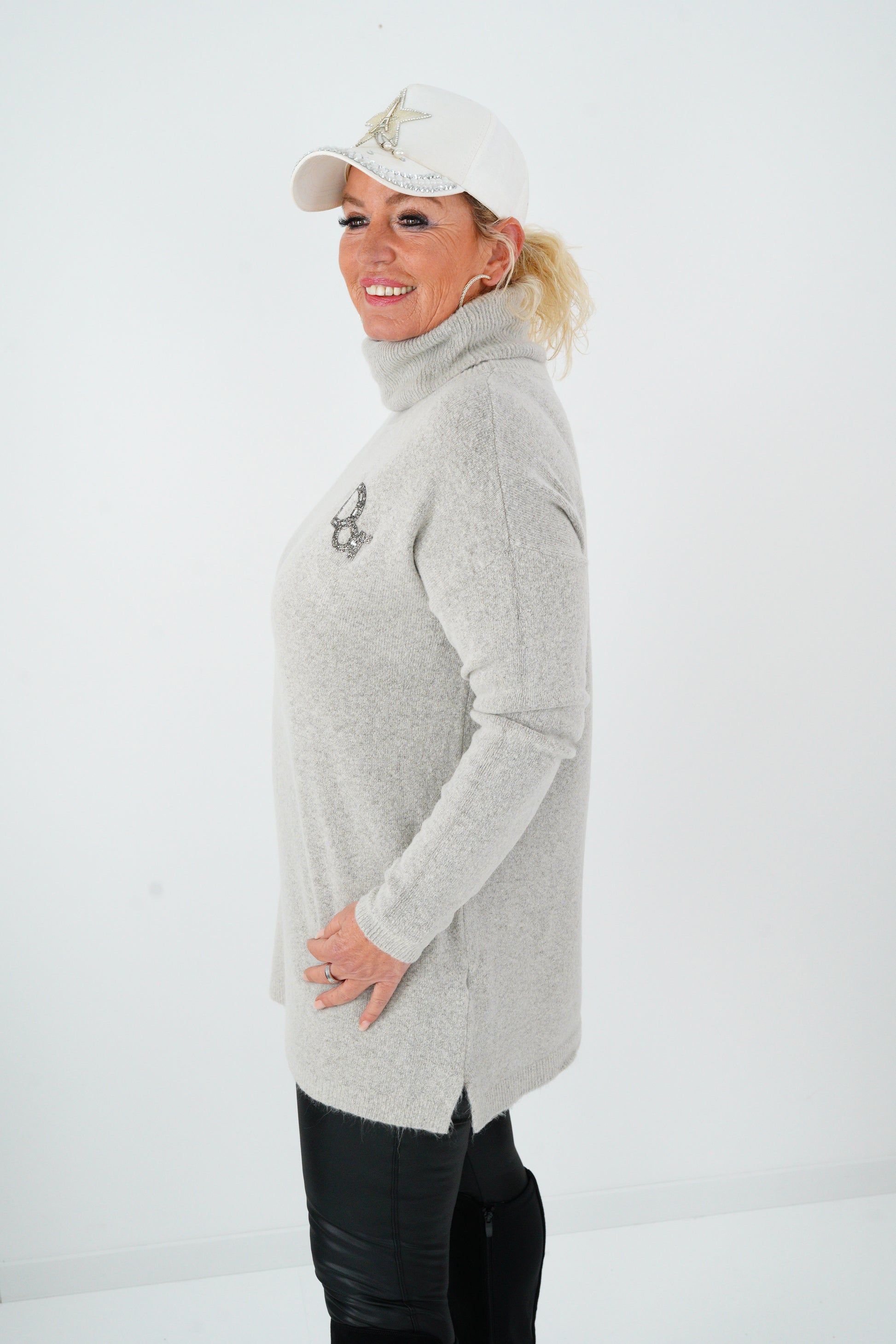 Ein femininer Pullover mit edlen Akzenten: Strassdetails und Print setzen funkelnde Highlights, die Longform schmeichelt der Figur – perfekt für stilvolle Everyday-Looks mit dem gewissen Etwas.