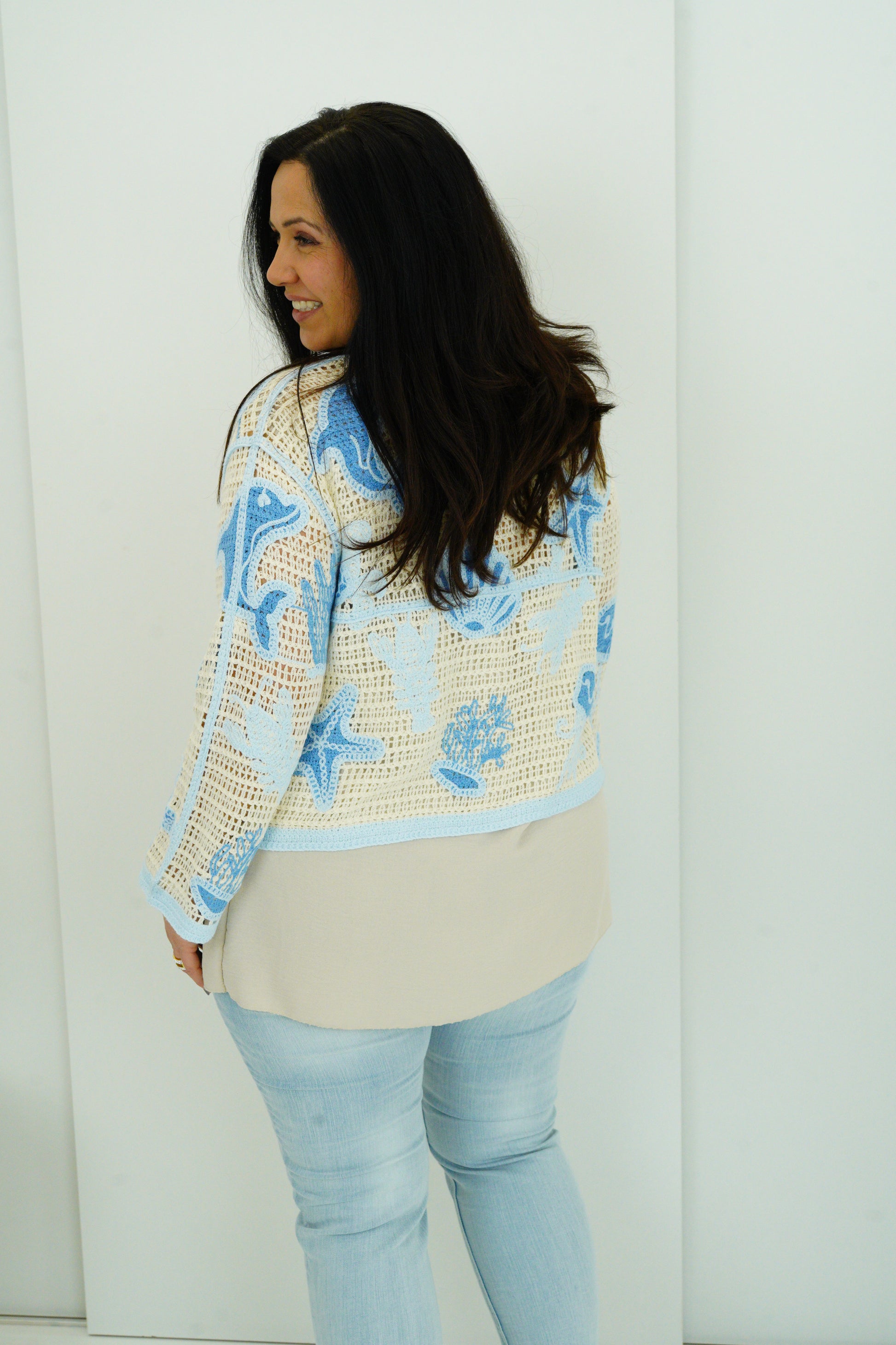 Häkel-Jacke in Ecru mit Jeans (36-42)