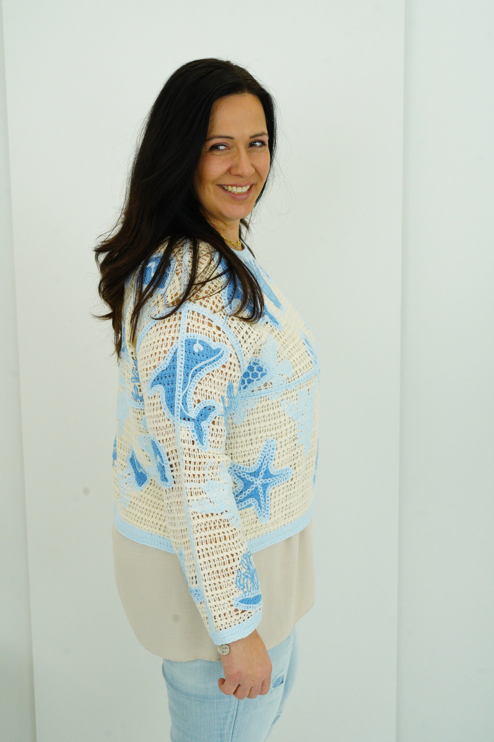 Dieser Pullover begeistert durch seine leichte, luftige Struktur und den frischen Farbmix aus Hellblau und Creme. Das transparente Häkelmuster sorgt für eine besondere Optik, während die kastige Form und das angenehme Baumwollmaterial hohen Tragekomfort bieten. Ideal für moderne Alltagslooks, die Leichtigkeit und Stil miteinander verbinden.