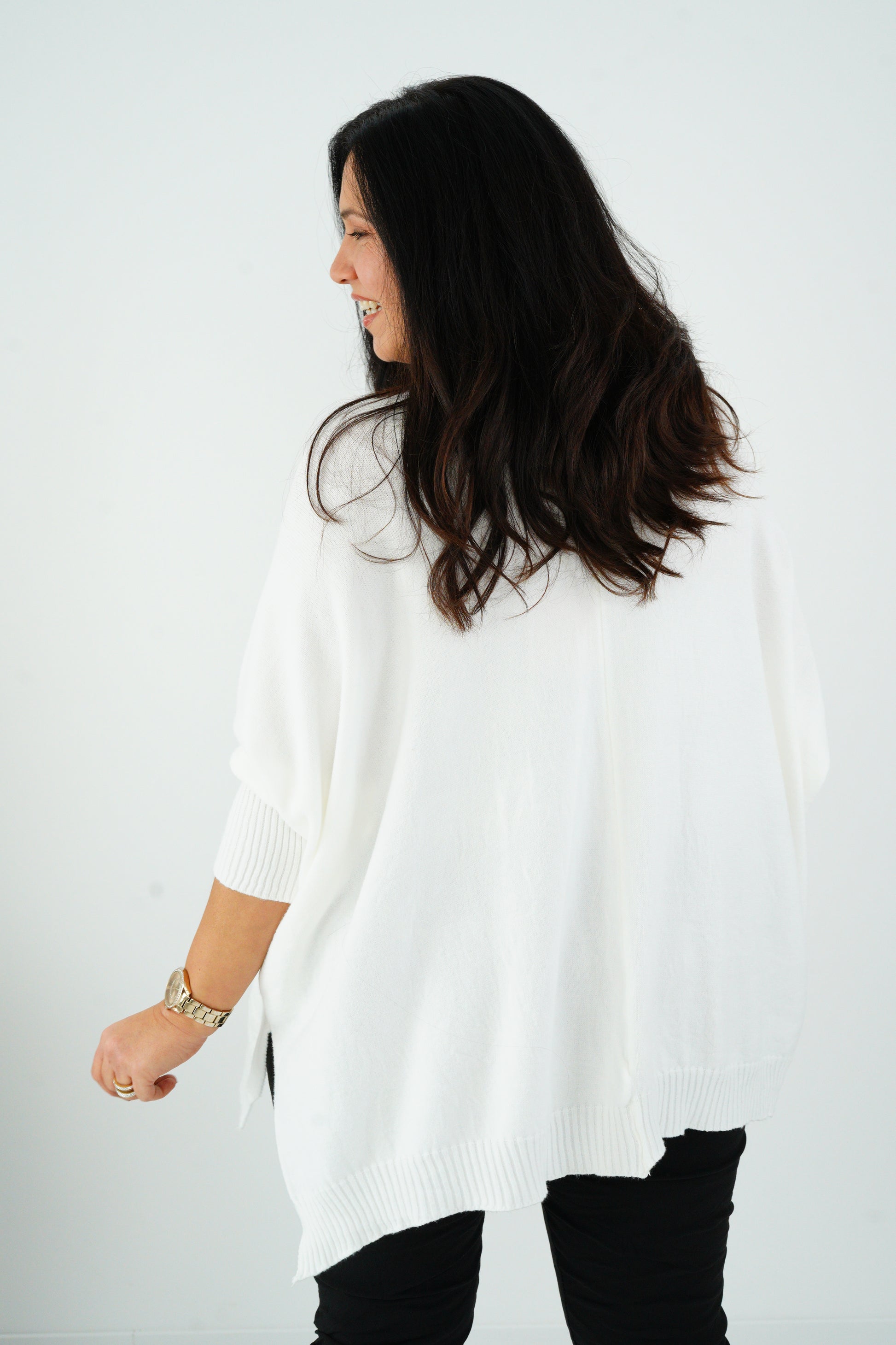 Ein lässiger Oversize-Pullover mit femininen Details. Die Knopfleiste und die seitlichen Schlitze machen ihn zum wandelbaren Lieblingsstück – perfekt für entspannte Looks mit Stil.