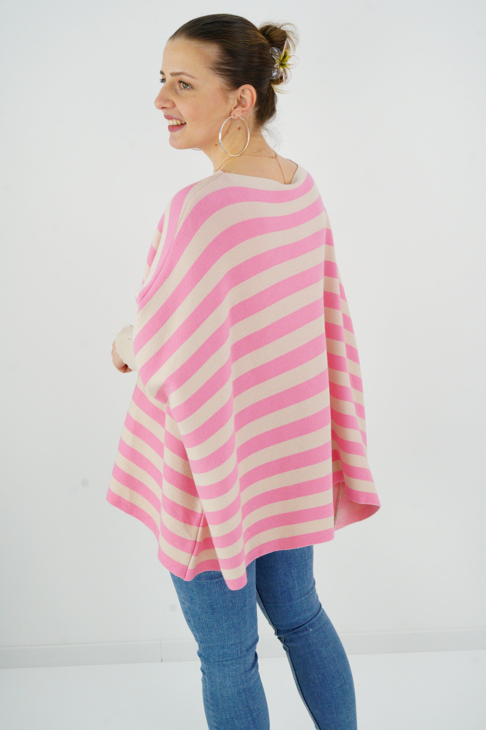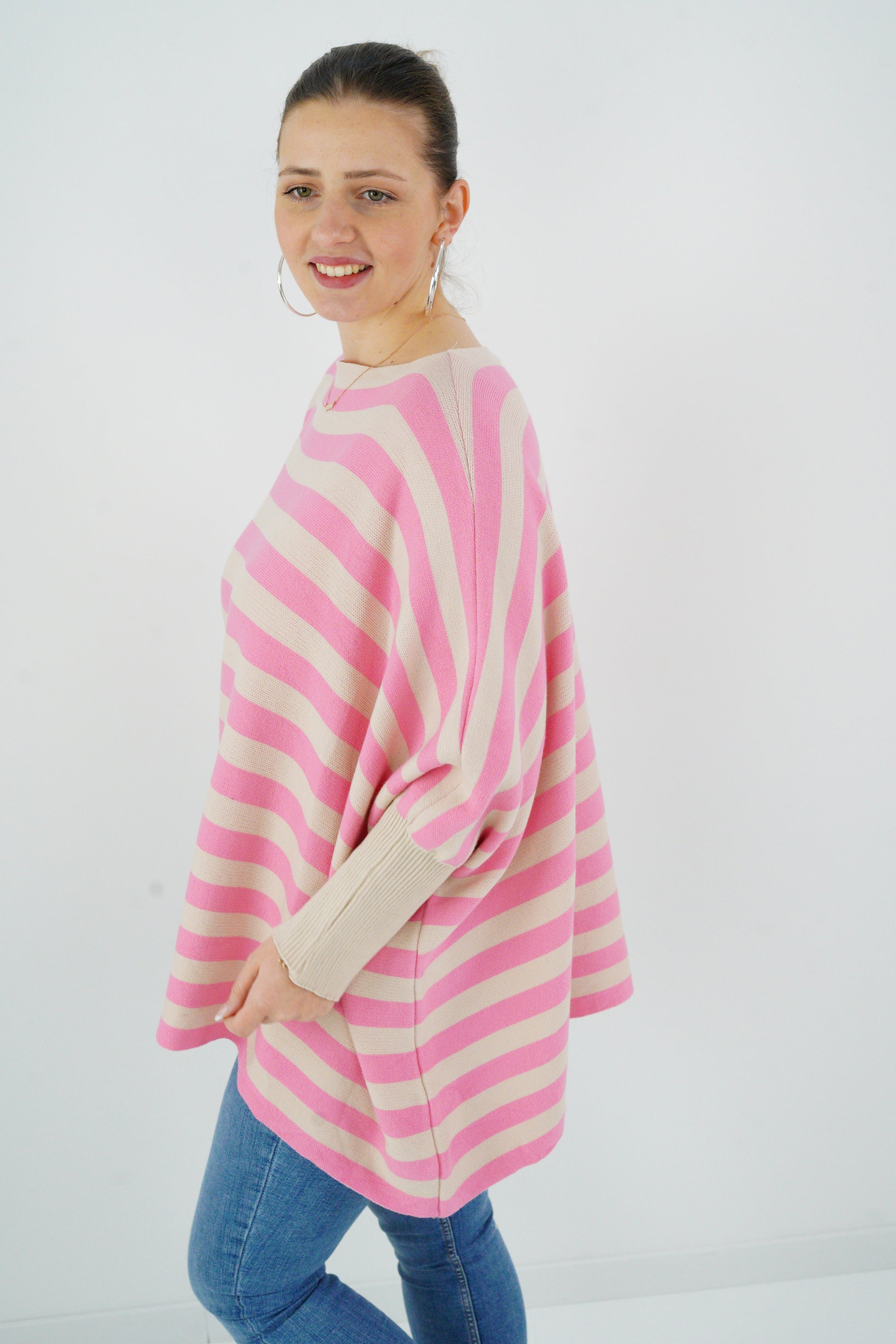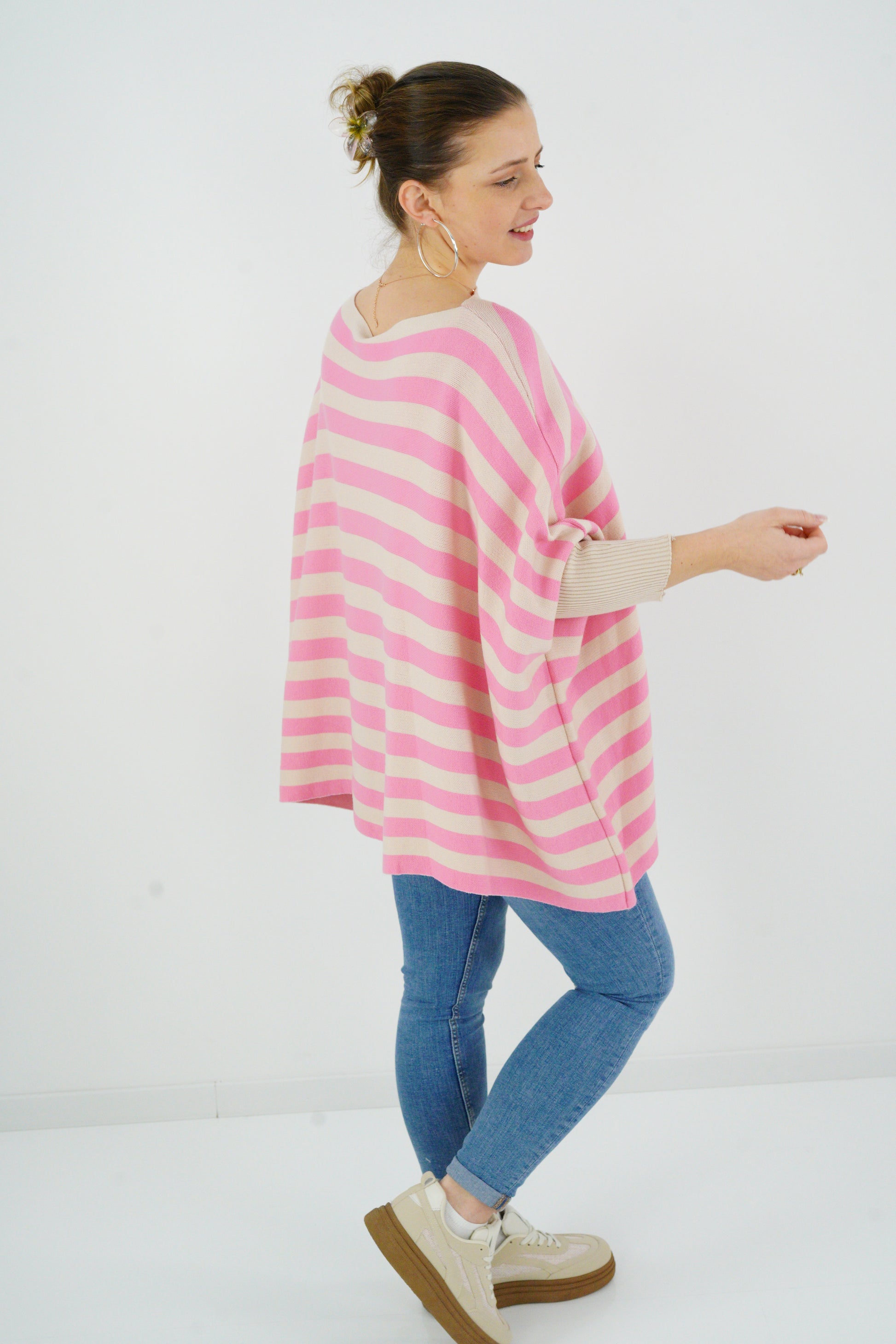 Dieser Pullover überzeugt durch seinen entspannten Oversize-Fit, der von Größe 38 bis 48 wunderbar tragbar ist und schmeichelnd fällt. Die Kombination aus Rosa und Beige wirkt modern und weich zugleich, während der hochwertige Materialmix für ein angenehmes Tragegefühl sorgt. Ein vielseitiges Lieblingsstück für stilvolle Alltagslooks, das Komfort, Trend und Figurschmeichelei perfekt miteinander verbindet.