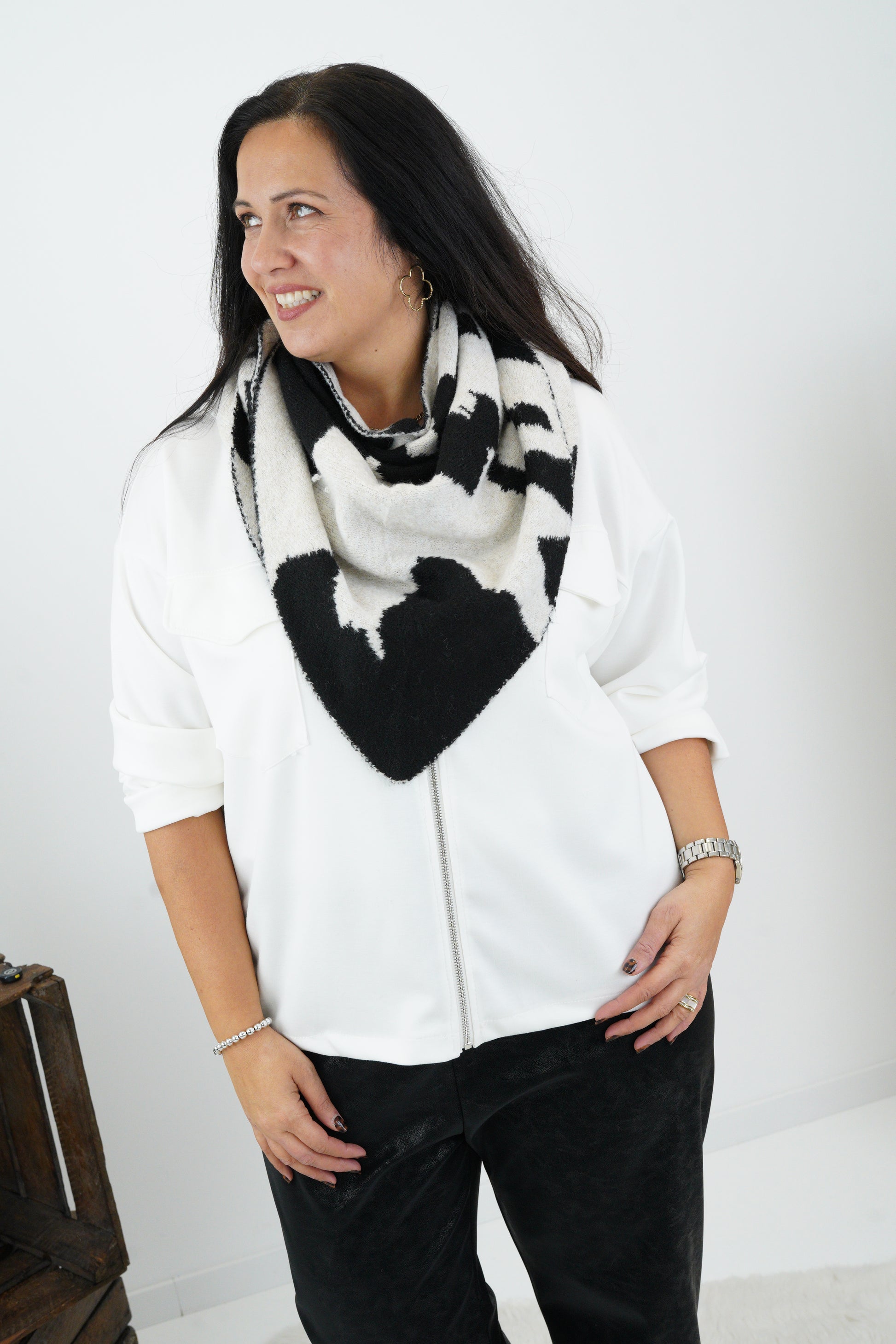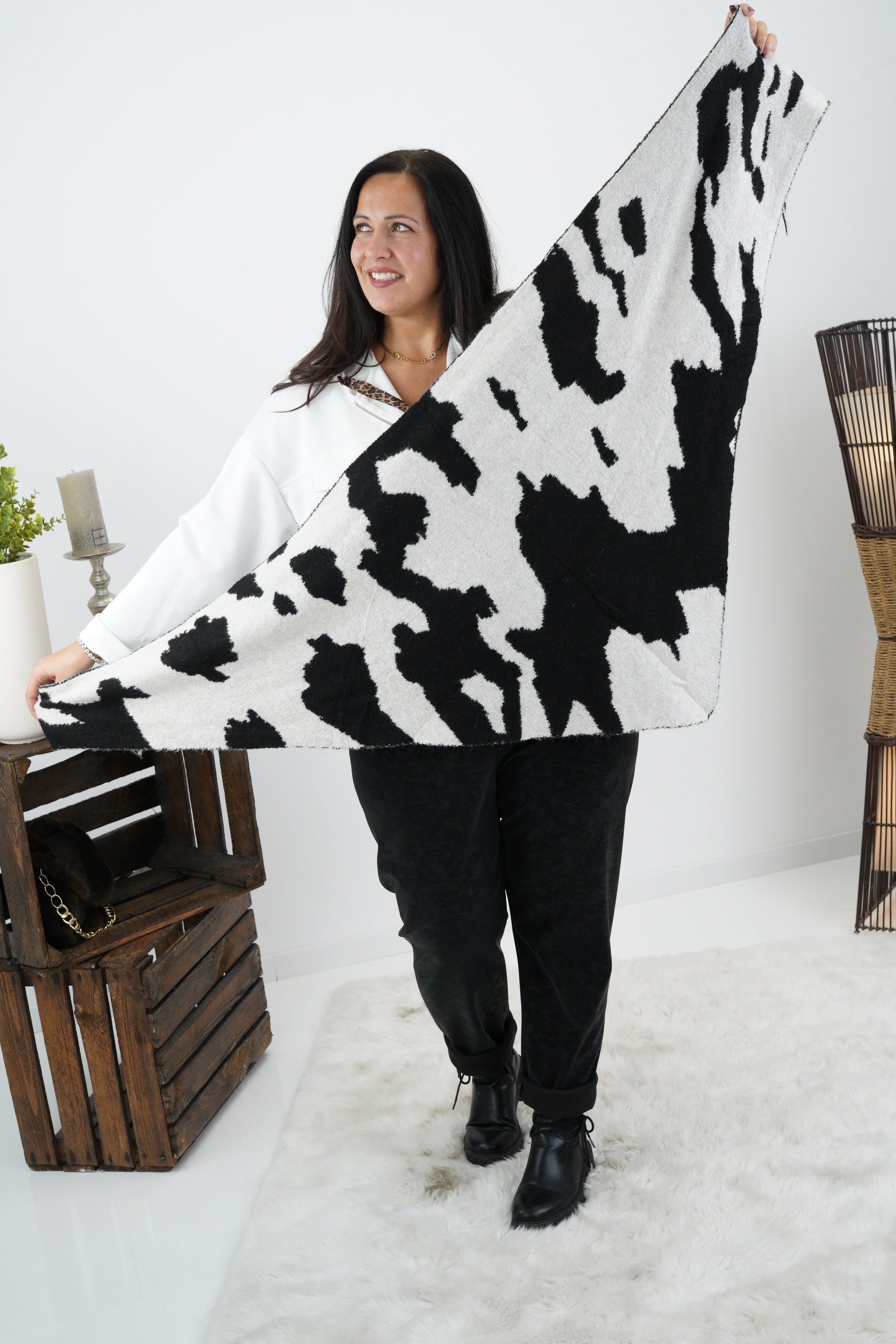 Ein zeitloser Schal, der durch seine Form vielseitig tragbar ist – ob locker über die Schultern gelegt oder gewickelt. Perfekt zum Einkuscheln an kühlen Tagen und ein elegantes Finish für deine Herbst- und Winter-Outfits.