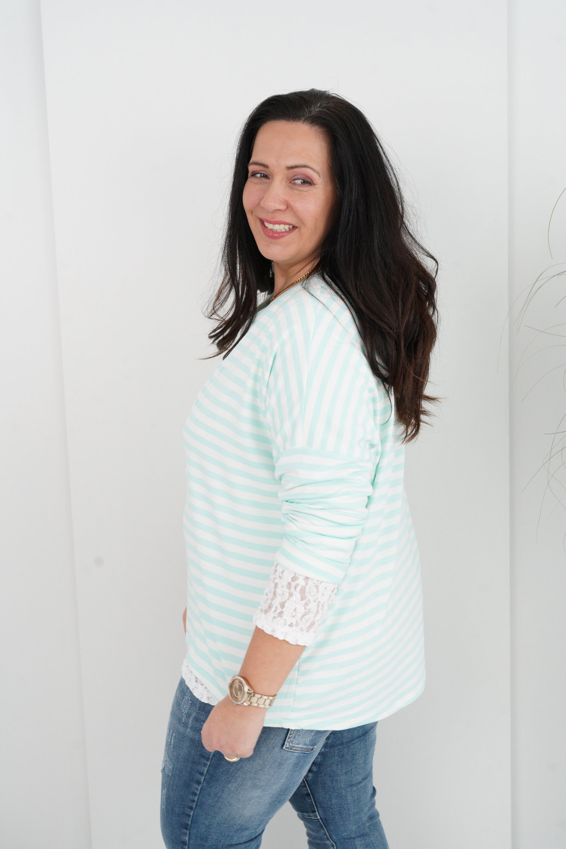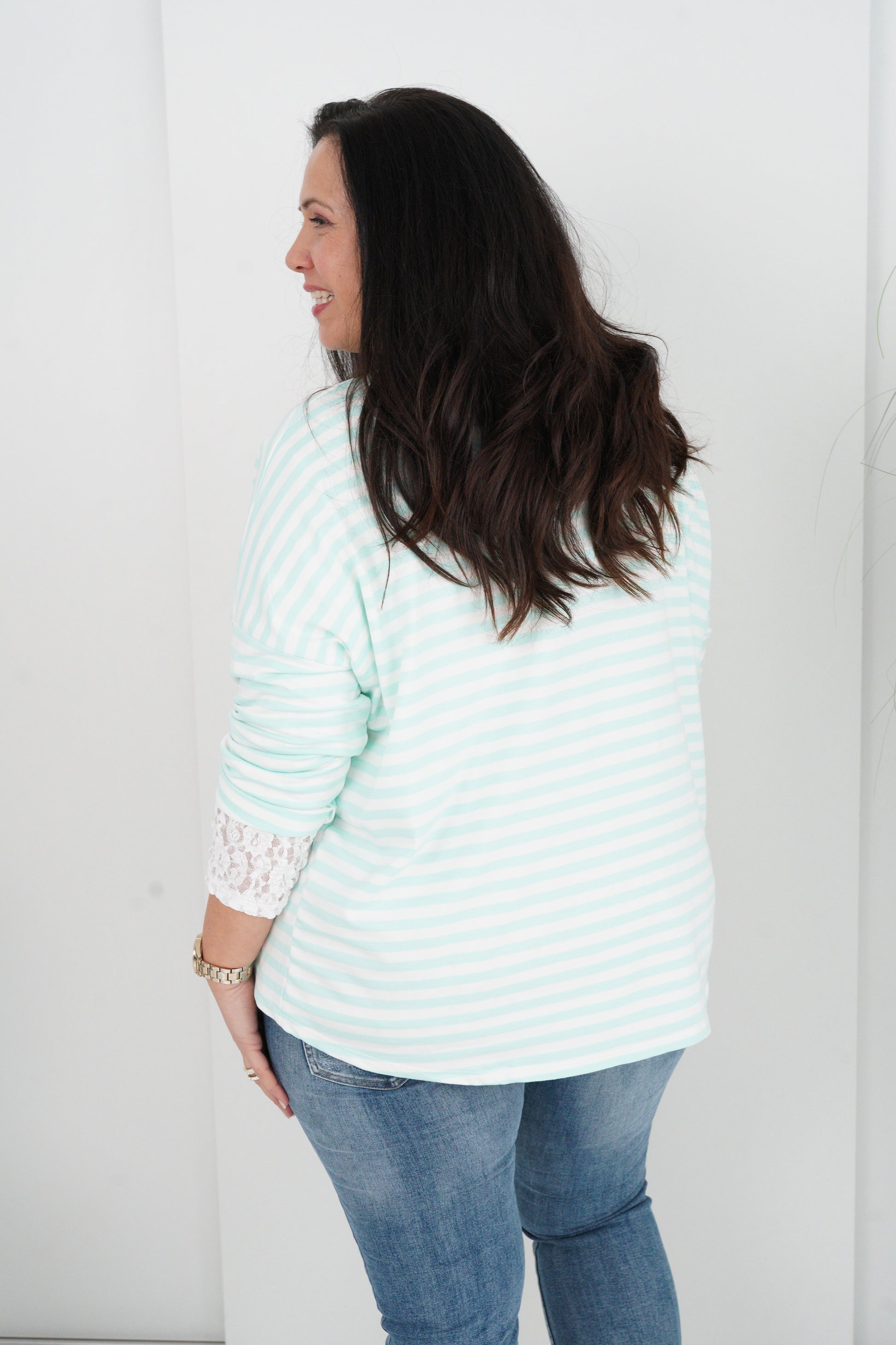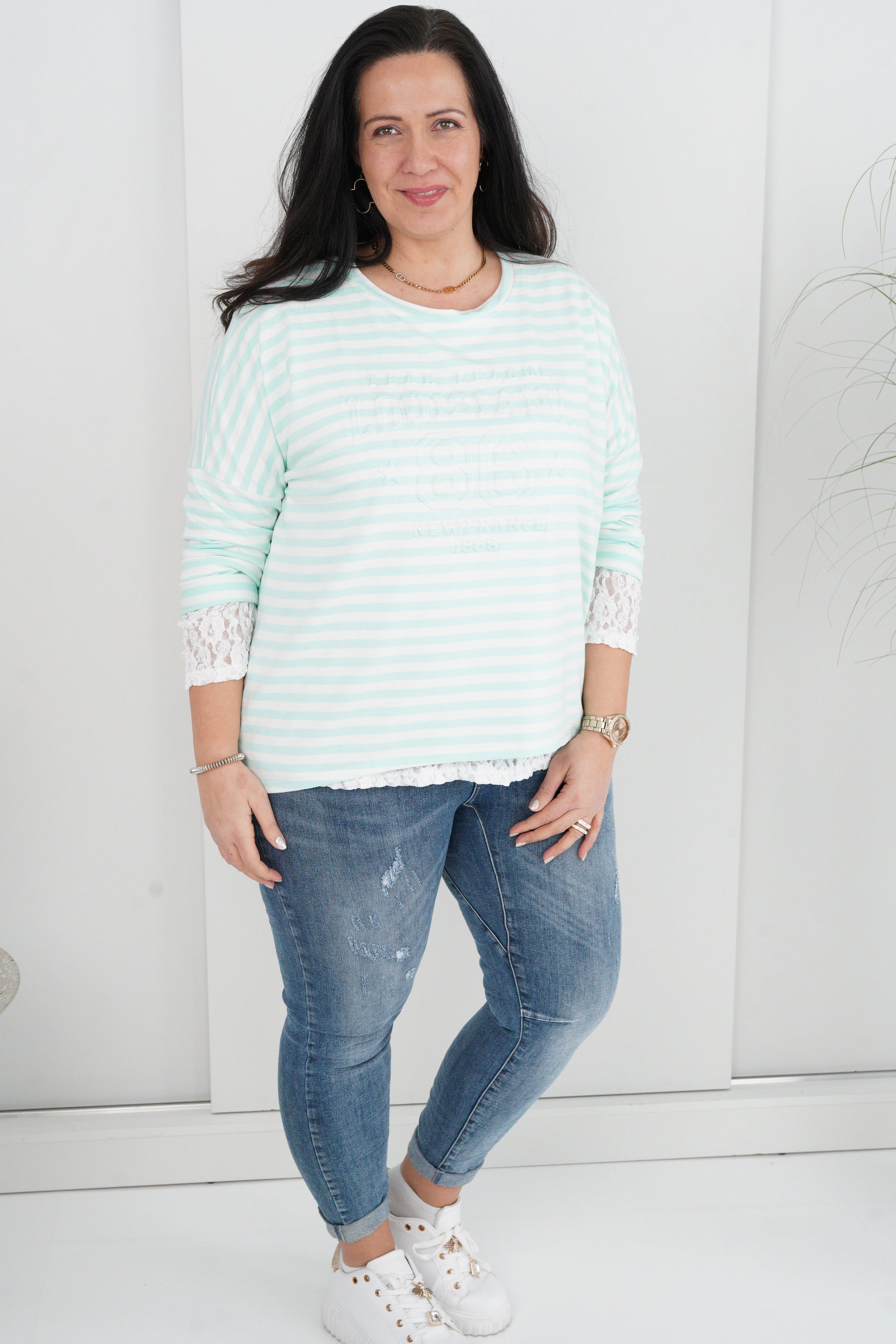 Modernes Langarmshirt mit klassischem Rundhalsausschnitt und frischem Streifen-Design in Mint und Weiß. Ein dekorativer 3D-Print setzt einen besonderen Akzent und verleiht dem Modell eine trendige, lebendige Ausstrahlung. Der Schnitt ist vorne etwas kürzer und hinten leicht verlängert gearbeitet.