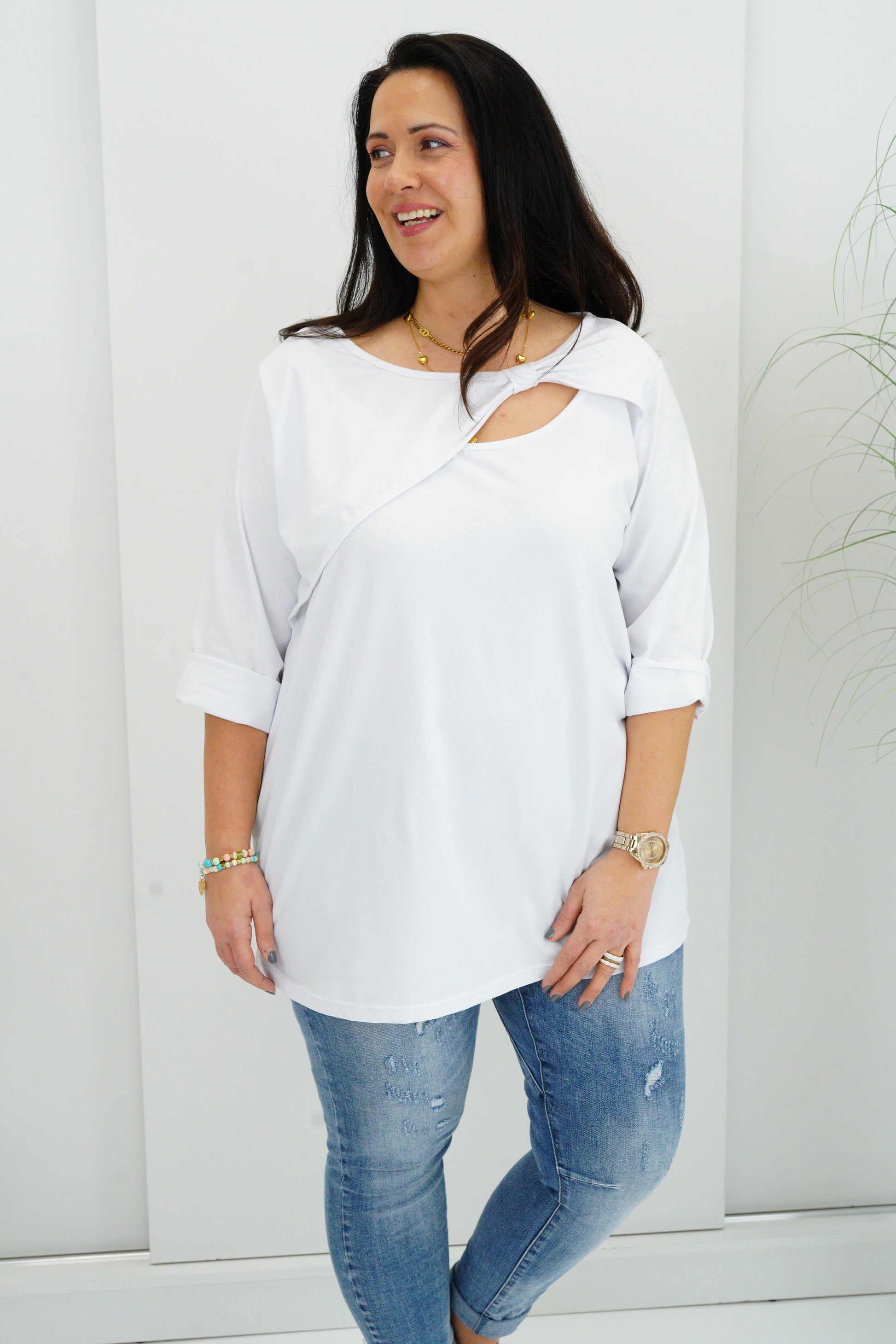 Dieses Shirt verbindet zeitlose Schlichtheit mit raffinierten Details und hohem Tragekomfort. Das cleane Weiß wirkt frisch und vielseitig kombinierbar, während der asymmetrische Überwurf und der feine Cut dem Look das gewisse Etwas verleihen. Ideal für stilvolle Alltags- oder Casual-Looks – bequem, modern und feminin.