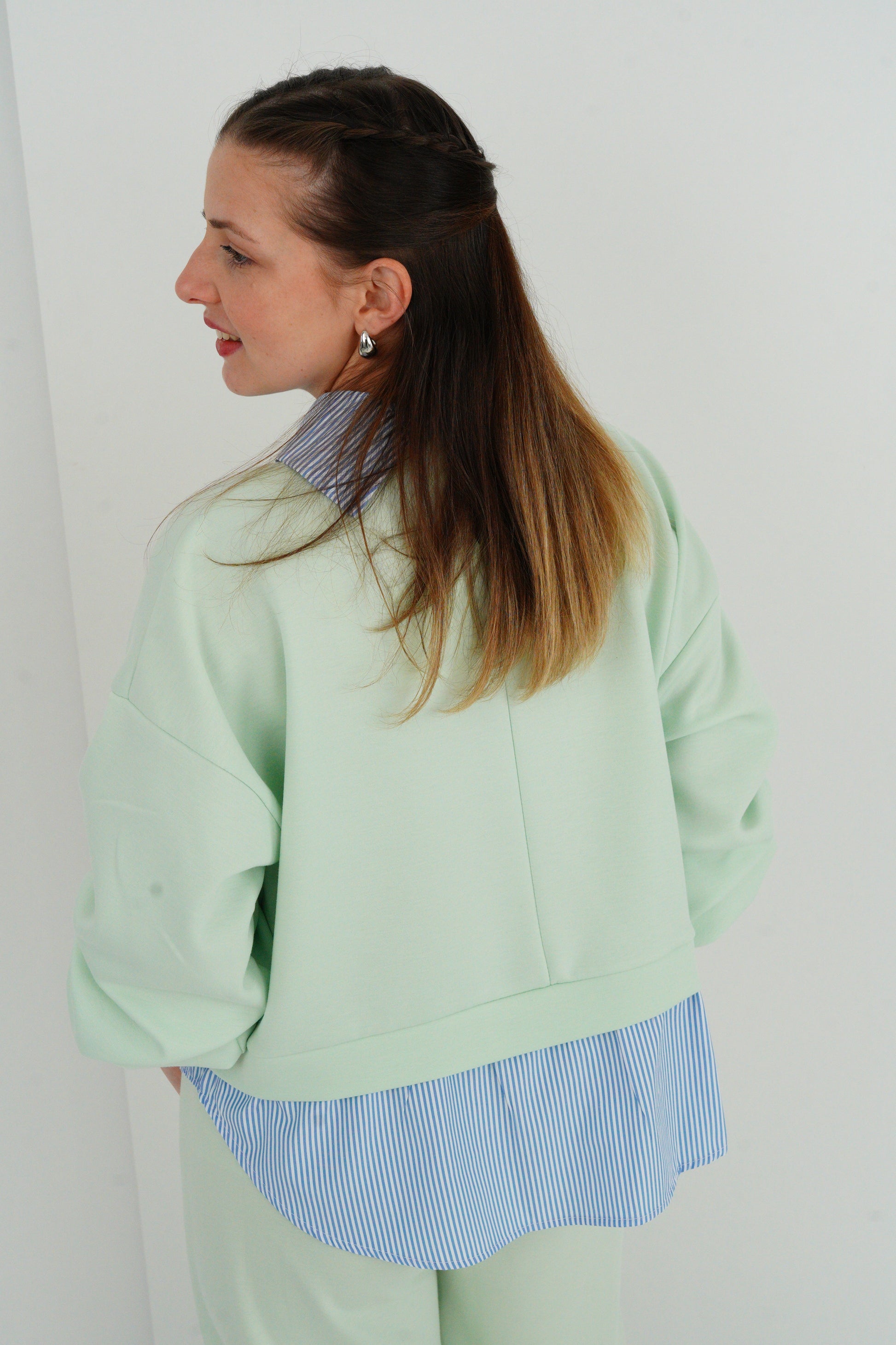 Dieses Sweatshirt vereint sportliche Bequemlichkeit mit stilvoller Eleganz und ist ideal für unkomplizierte Alltagslooks mit dem gewissen Etwas. Der frische Mintton wirkt leicht und modern, während das raffinierte Blusen-Detail den Look sofort angezogener erscheinen lässt – perfekt für Büro, Freizeit oder entspannte City-Outfits.