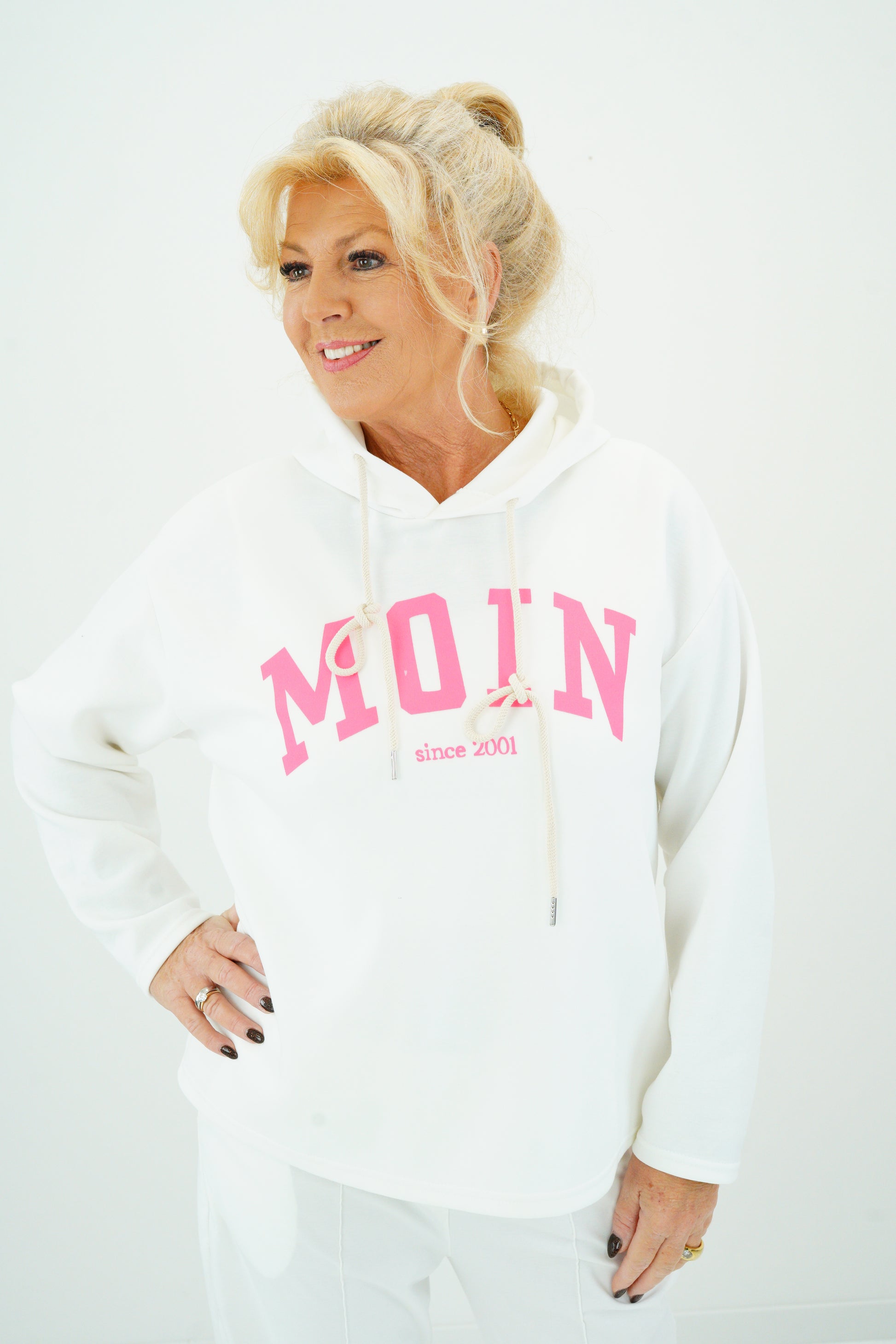 Dieses weiße Kapuzen-Sweatshirt punktet mit einem frischen, sportiven Look und einem leuchtenden Neonprint, der moderne Akzente setzt. Dank der soften Viskosemischung trägt es sich angenehm auf der Haut – perfekt für urbane Styles, entspannte Wochenenden oder als Kontrast zur klassischen Jeans oder Jogpant. Ein lässiger Allrounder mit Statement-Charakter.