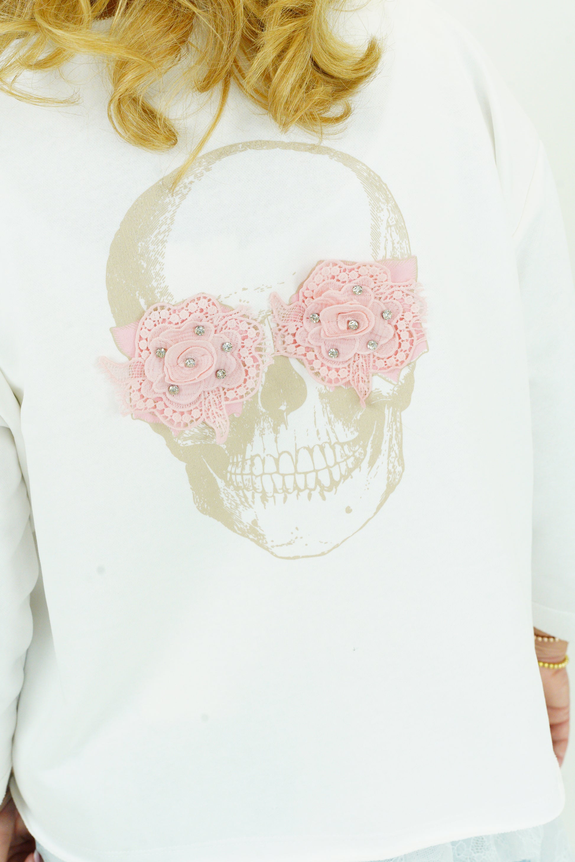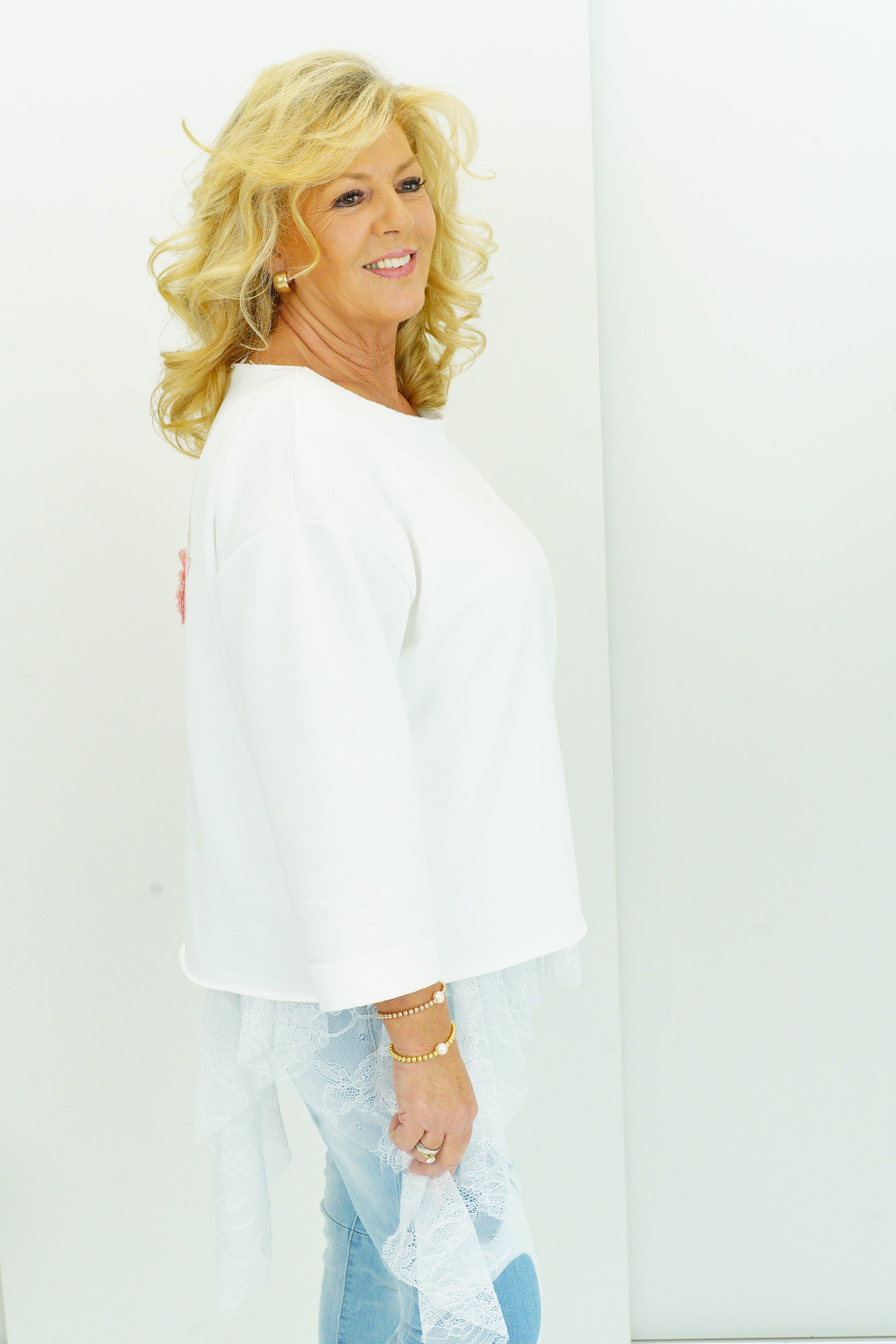 Modernes Sweatshirt mit weitem Rundhalsausschnitt und farblich abgesetztem Brustprint. Der Rücken ist mit aufgesetzten Häkelspitzen und funkelnden Strasssteinen verziert und setzt besondere Akzente. Die Abschlüsse sind mit feinen Rollnähten gearbeitet und unterstreichen den hochwertigen Look.