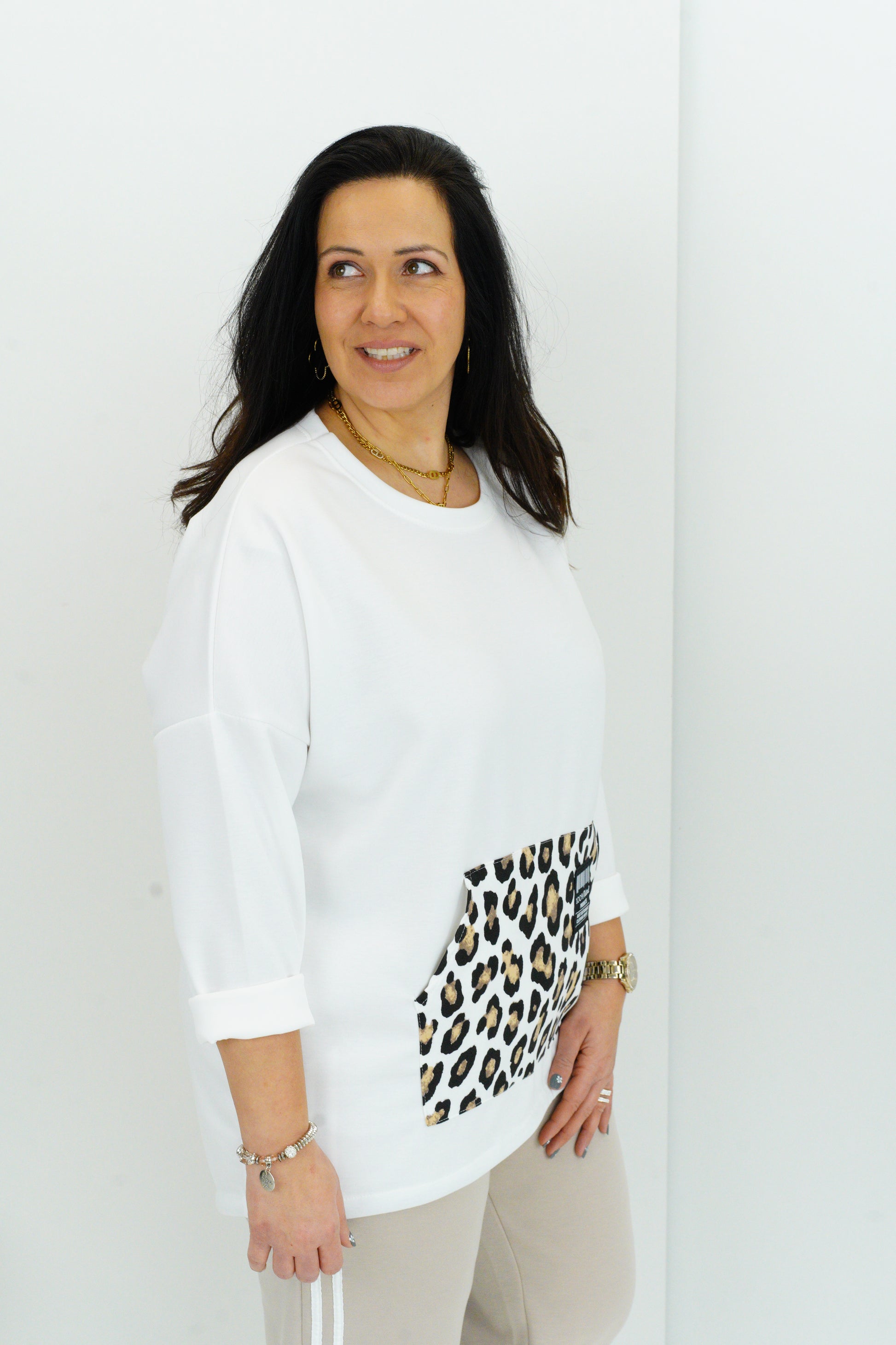 Dieses Sweatshirt vereint hohen Tragekomfort mit einem trendigen Design. Das cleane Weiß bildet einen schönen Kontrast zum Leo-Detail und macht das Modell zu einem echten Hingucker im Alltag. Dank des Tunnelzugs lässt sich die Weite individuell anpassen – ideal für moderne, bequeme Looks mit modischem Statement.
