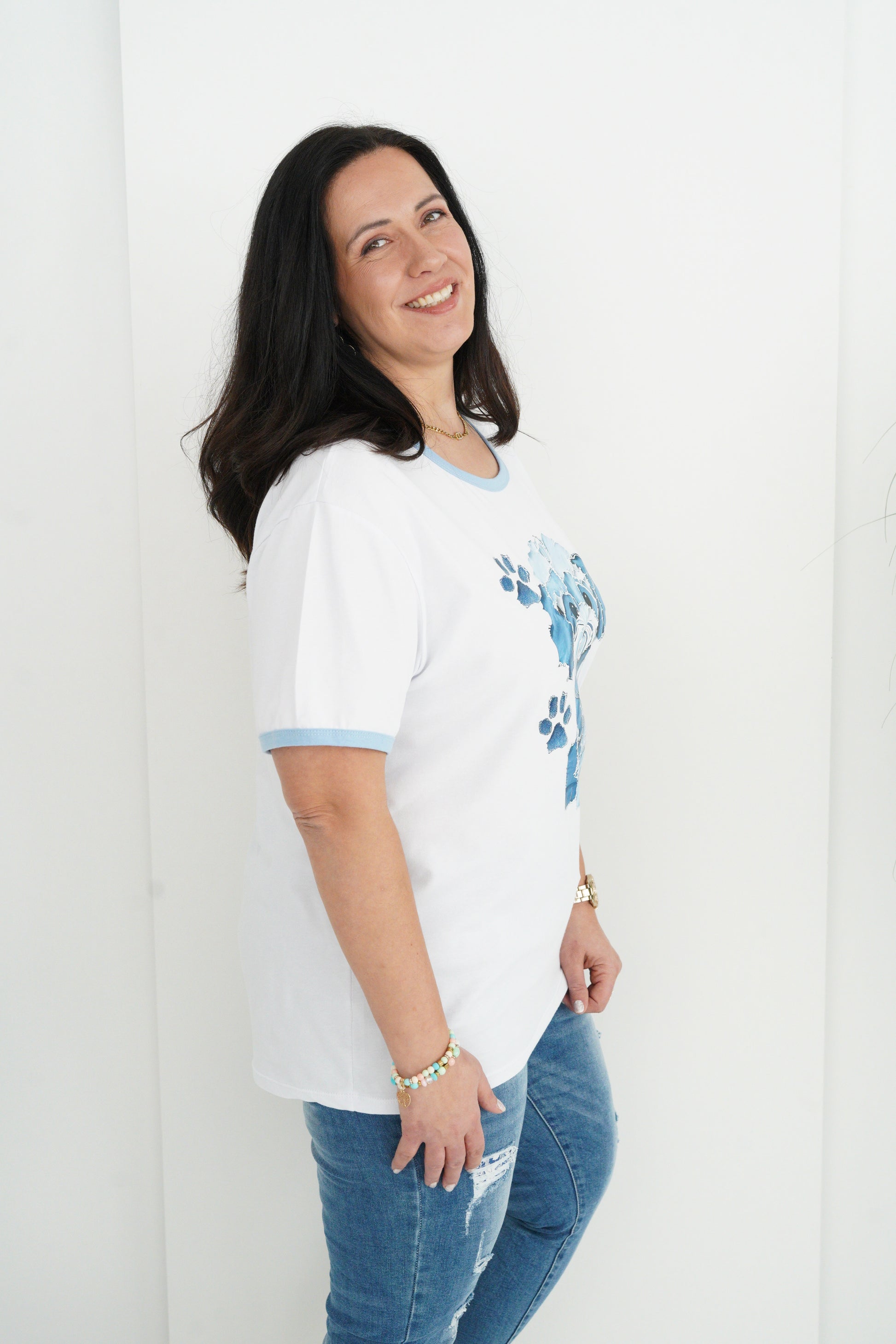 Dieses T-Shirt überzeugt mit einem frischen Weiß-Blau-Look und einem modernen farblichen Print auf der Vorderseite. Der klassische Rundhalsausschnitt sorgt für eine zeitlose Optik, während Hals und Ärmelabschluss farblich abgesetzt und fein abgesteppt sind. Diese Details geben dem Shirt eine sportlich-moderne Note und machen es zu einem unkomplizierten Begleiter für viele Outfits.