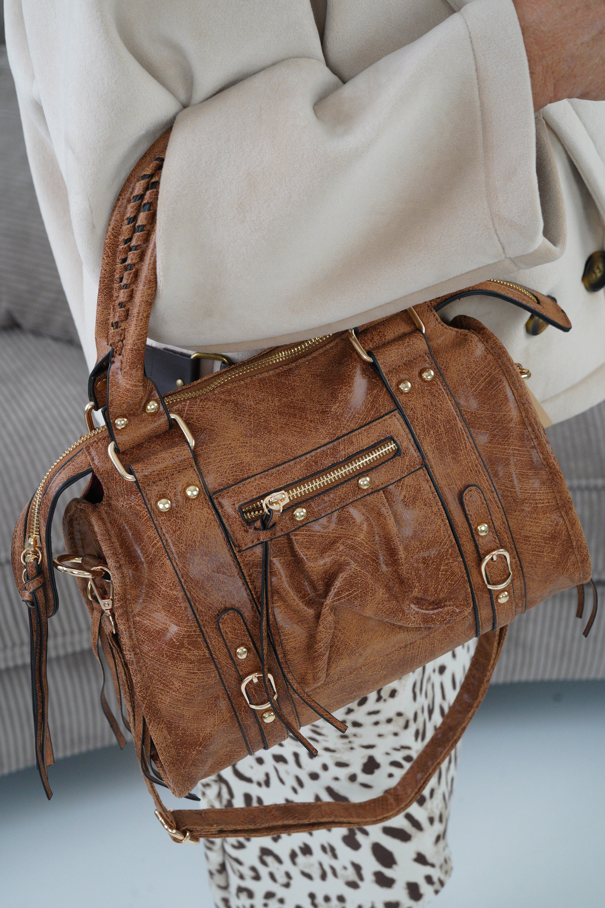 Diese Tasche in edlem Cognac-Ton ist ein echtes Highlight! Die Kombination aus strukturierter Oberfläche, dekorativen Elementen und praktischer Innenaufteilung macht sie zum perfekten Begleiter – ob für den Alltag oder besondere Anlässe.