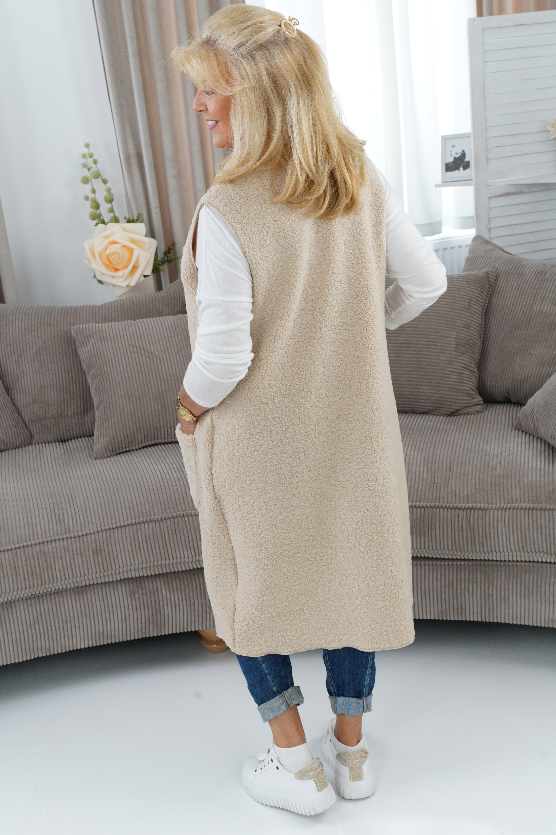 Ein echtes Lieblingsstück für die Übergangszeit – ob über Shirt, Bluse oder Pullover. Diese lange Teddy-Weste bringt Wärme, ohne einzuengen – ideal zum Layern und Wohlfühlen.